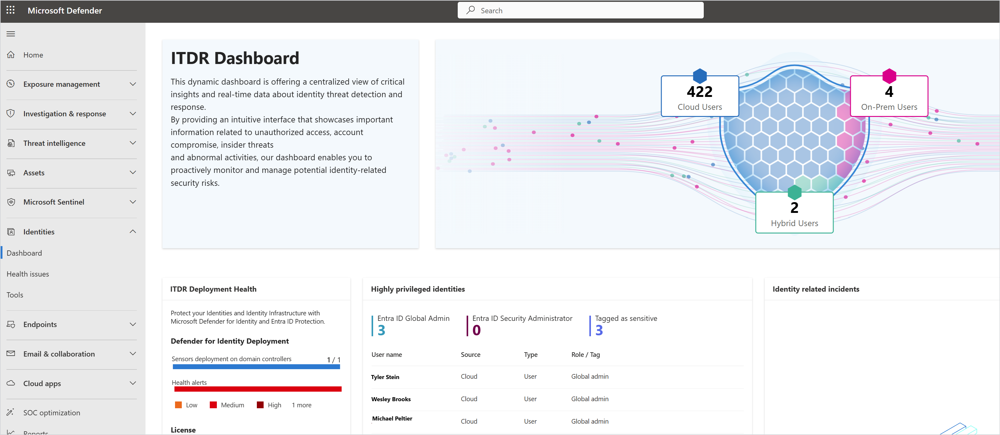 Nella sezione Identità del portale di Defender monitorare l'integrità degli utenti e degli account e gestire in modo proattivo i rischi correlati all'identità con Defender per identità.