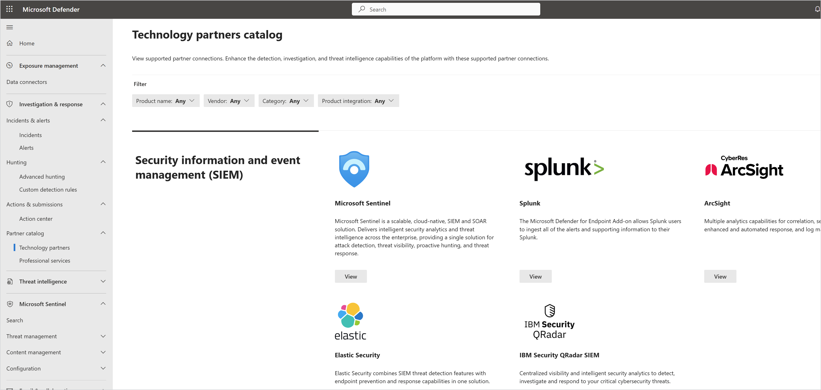 La sezione Catalogo partner fornisce informazioni sui partner Defender.