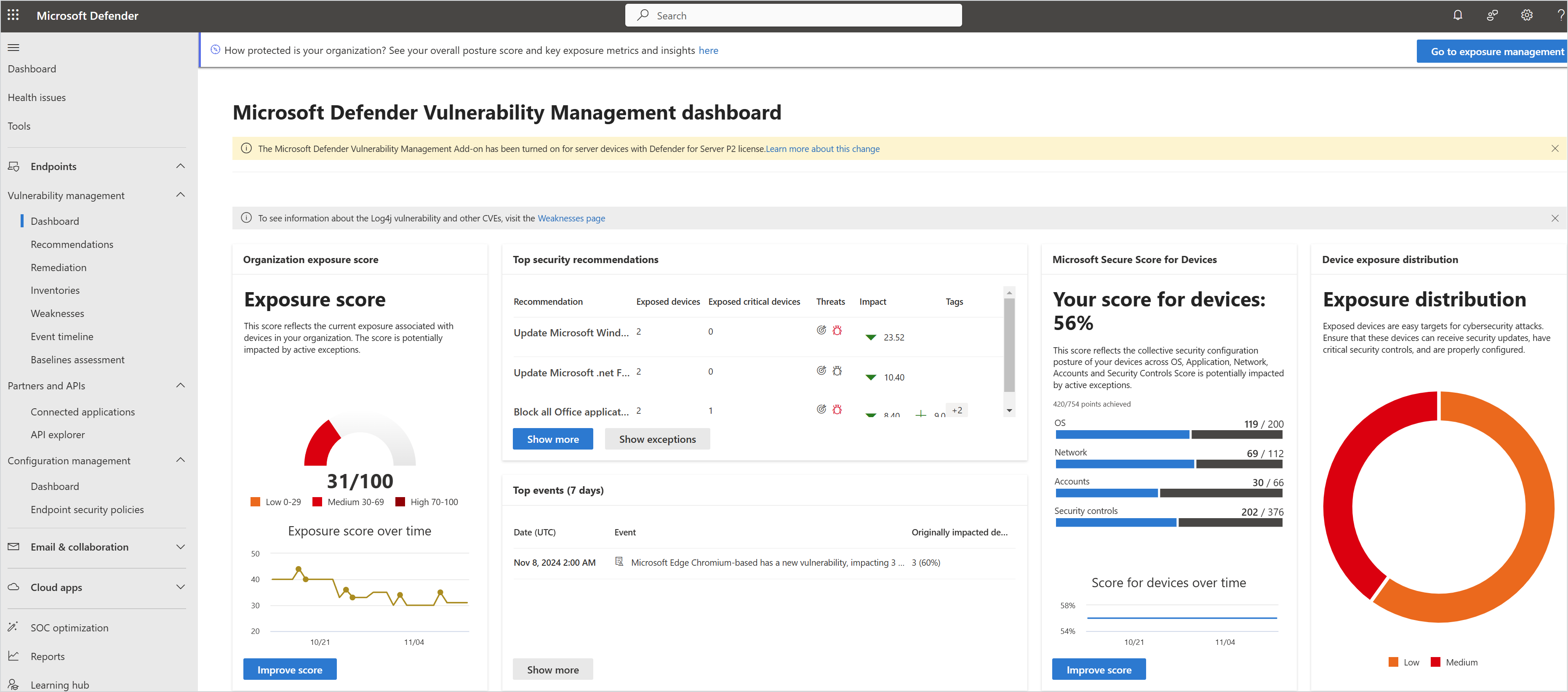 Nella sezione Endpoint del portale monitorare e gestire le vulnerabilità degli asset con Gestione delle vulnerabilità di Microsoft Defender.