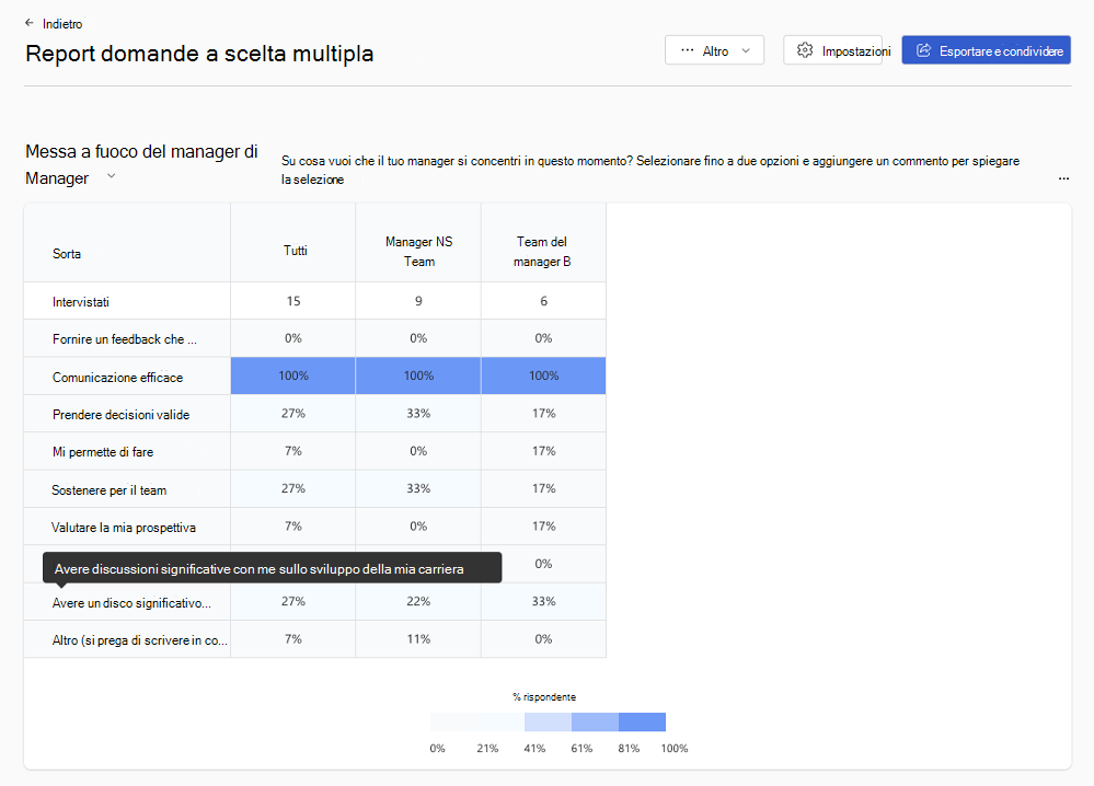 Per entrambi i team, tutti gli utenti hanno selezionato "Comunicare in modo efficace" come area di interesse per il proprio manager. Poiché gli utenti possono selezionare fino a due opzioni, le percentuali totali in tutte le risposte per la domanda non sono uguali al 100%. Gli amministratori possono usare questo report per scoprire dove la percentuale più alta di utenti ha selezionato aree di interesse per i manager più importanti per i loro manager.