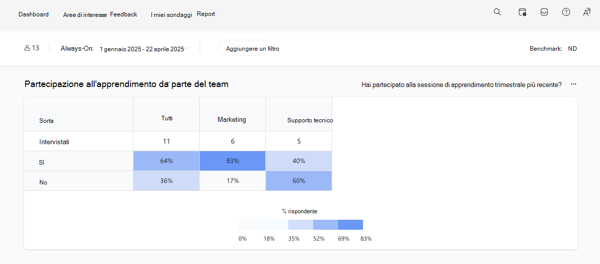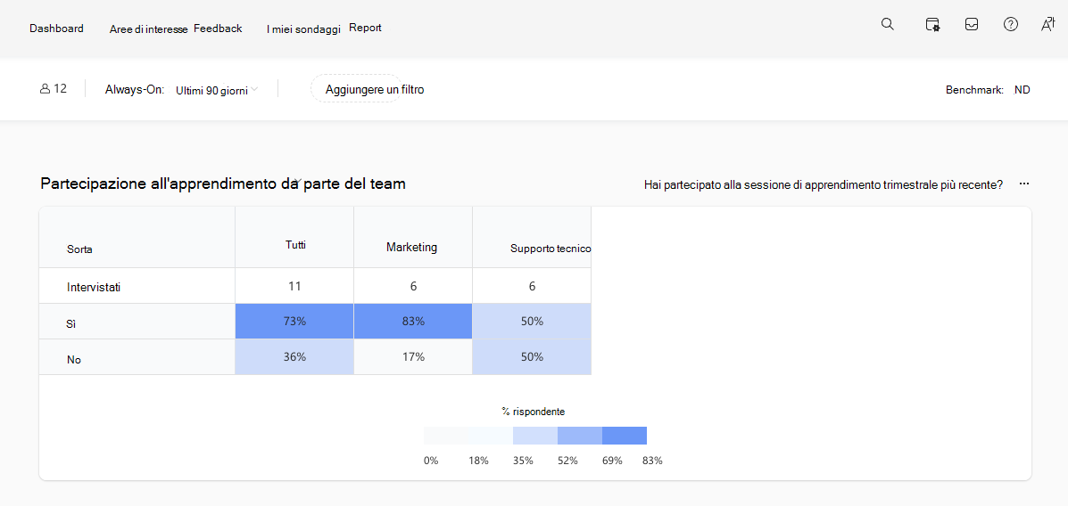 Un utente di Contoso nota che il totale delle percentuali per le risposte a una domanda a selezione multipla (Sì o No) nel sondaggio Always-On è maggiore del 100%. In questo esempio, il totale delle risposte Sì e No a "Hai partecipato alla sessione di apprendimento trimestrale più recente?" è del 109%.