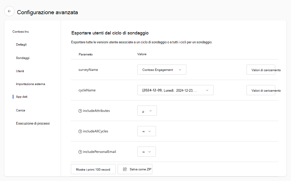 Esportare i dati del ciclo di sondaggio con l'app dati EXPORT_USERS_FROM_SURVEY_CYCLE per il sondaggio deve essere aggiornata.