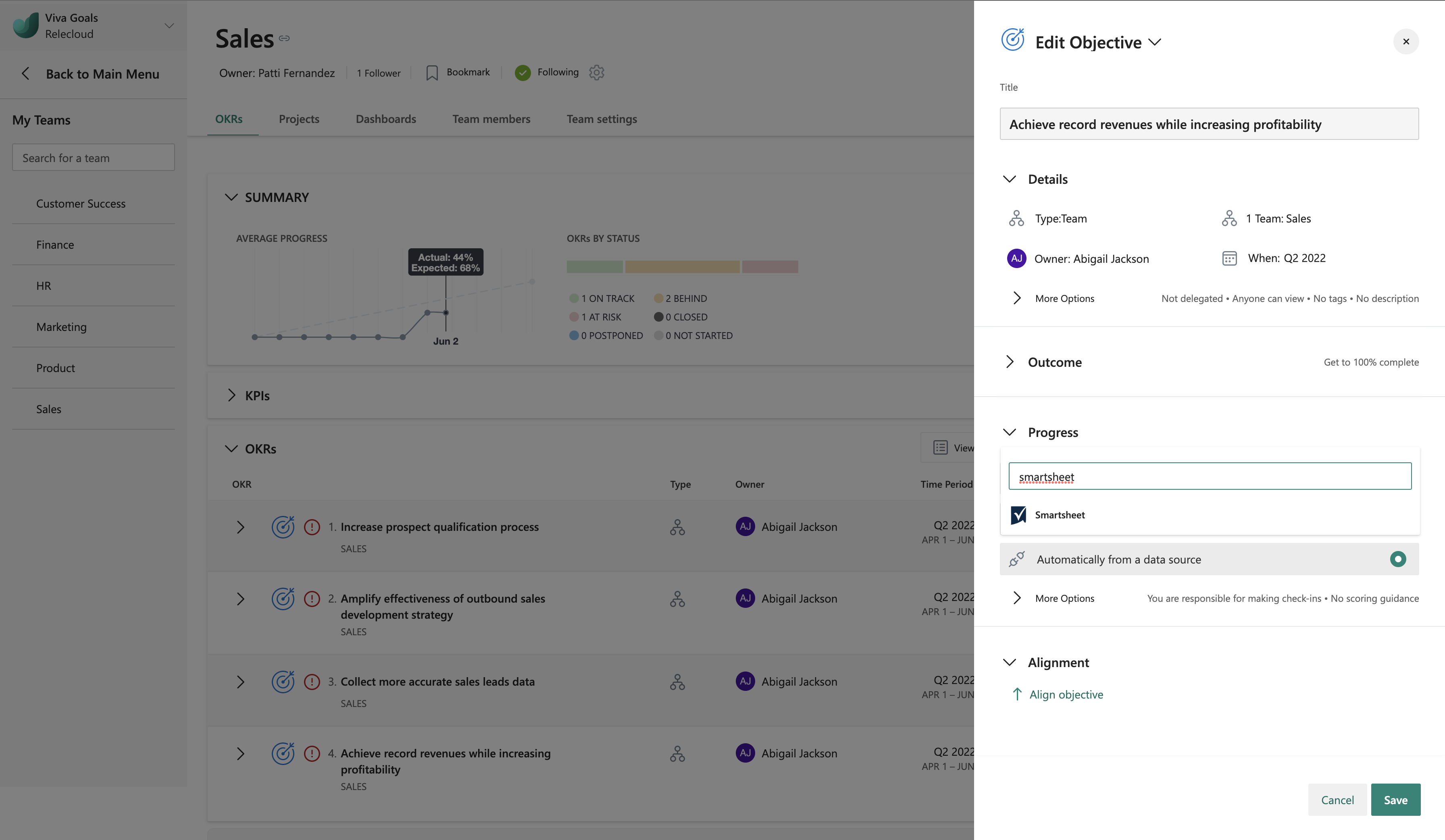L'integrazione Viva Goals Smartsheet consente di collegare obiettivi e risultati chiave (OKR) alle celle di Smartsheet per gli aggiornamenti dello stato in tempo reale. Si supponga, ad esempio, di usare un foglio vendite per tenere traccia dei ricavi. Con l'integrazione di Smartsheet, puoi risparmiare il fastidio di andare avanti e indietro tra i fogli e Viva Goals per aggiornare i tuoi progressi. Viva Goals sincronizzeranno i valori, risparmiando tempo mantenendo aggiornati gli OKR.