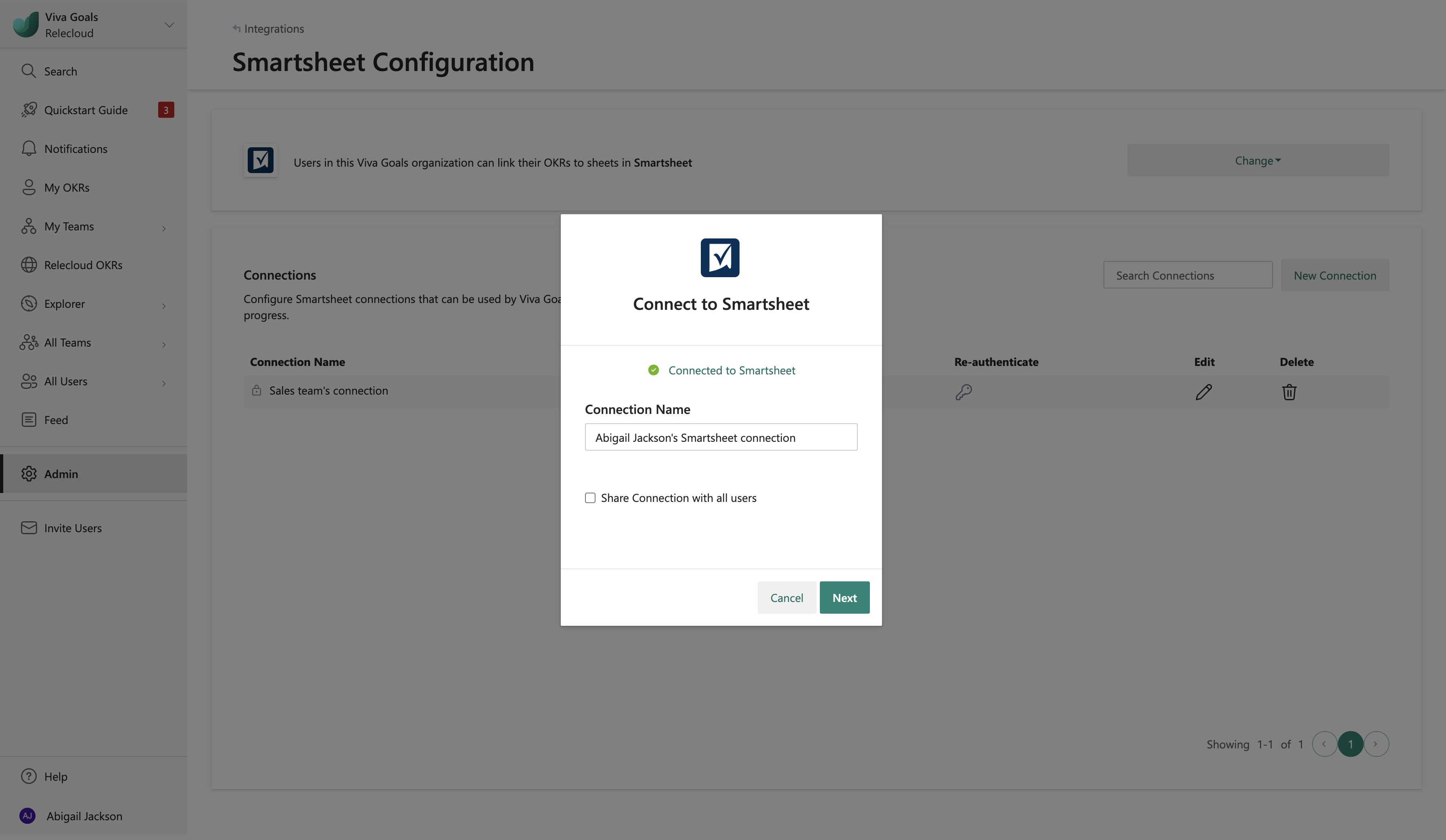 Viva Goals consente di connettersi con più account Smartsheet. Selezionare Nuova connessione per aggiungere un'altra istanza. Si usano nomi per distinguere le connessioni. I nomi vengono visualizzati agli utenti quando collegano i propri OKR alle celle smartsheet.