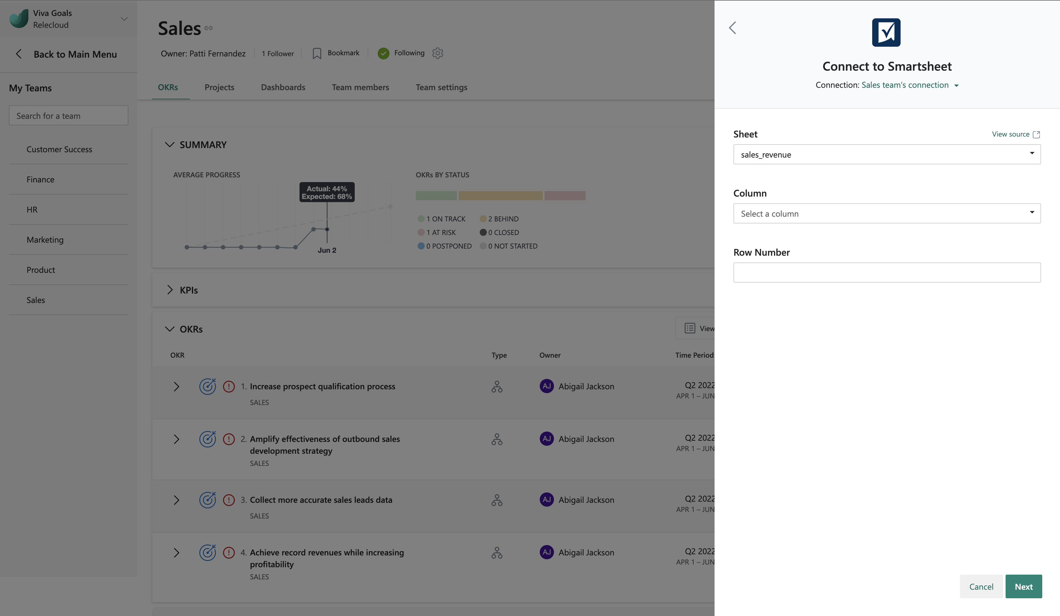Ora che l'integrazione è abilitata, il team può collegare una cella Smartsheet con un OKR.