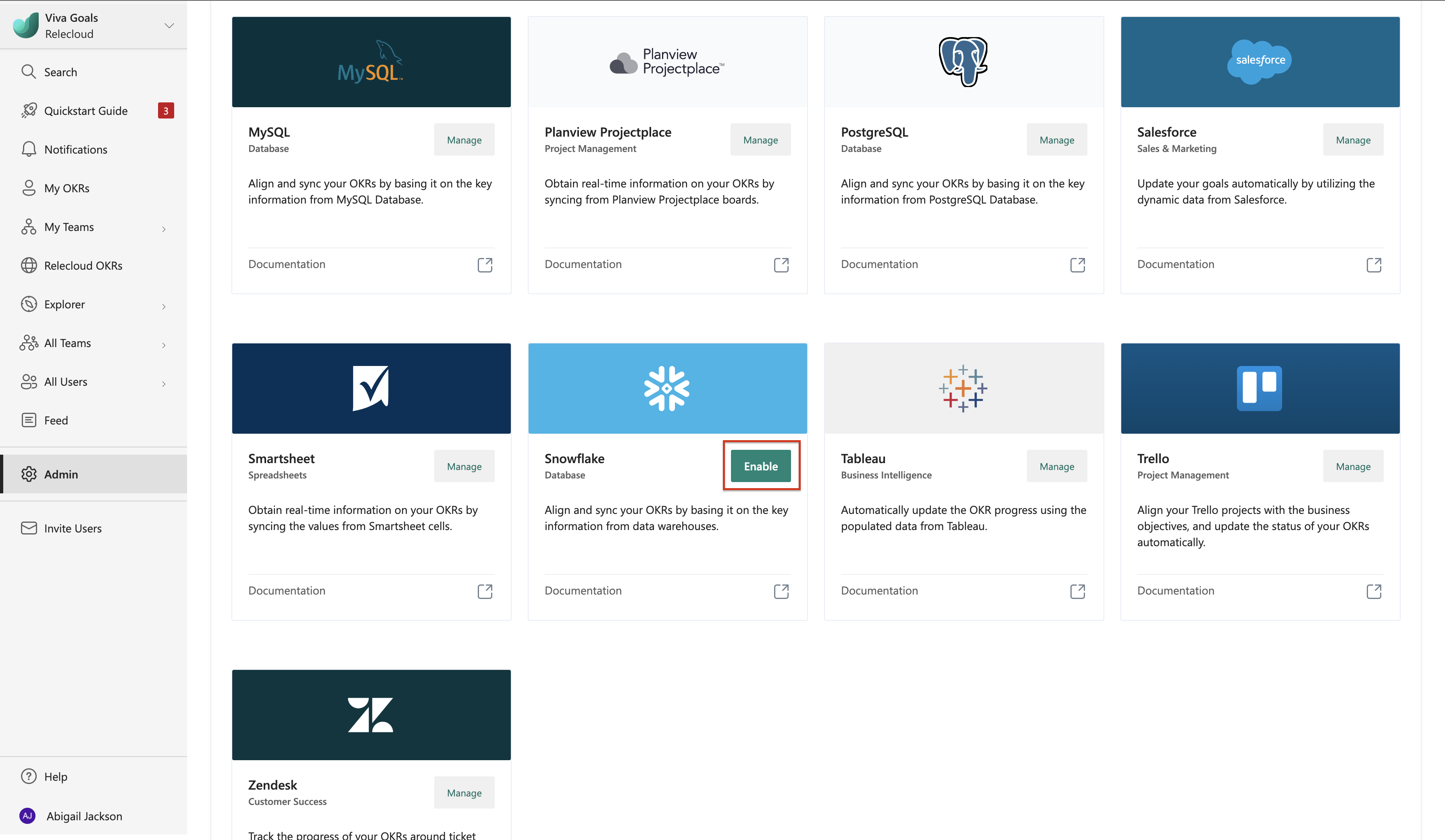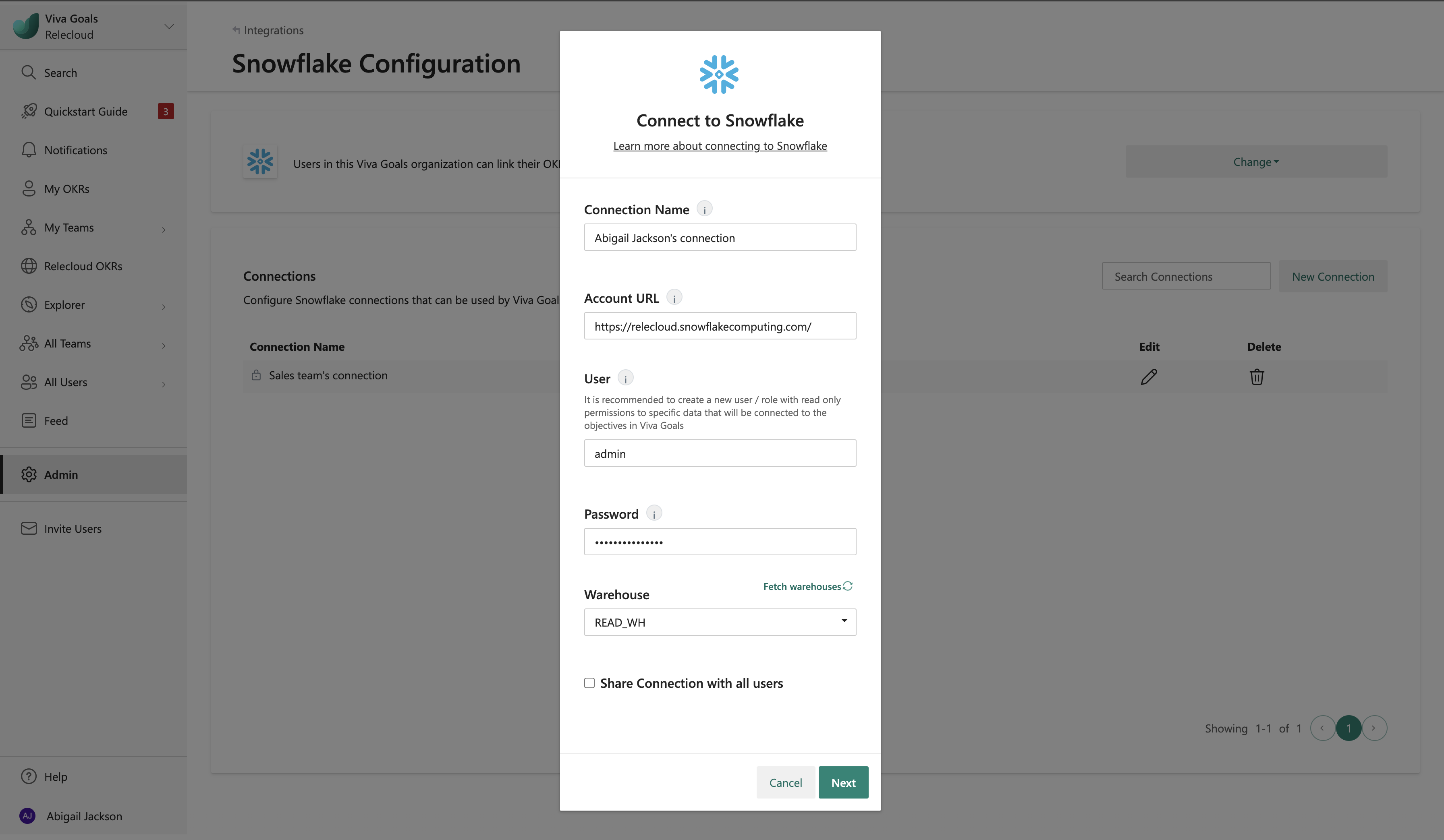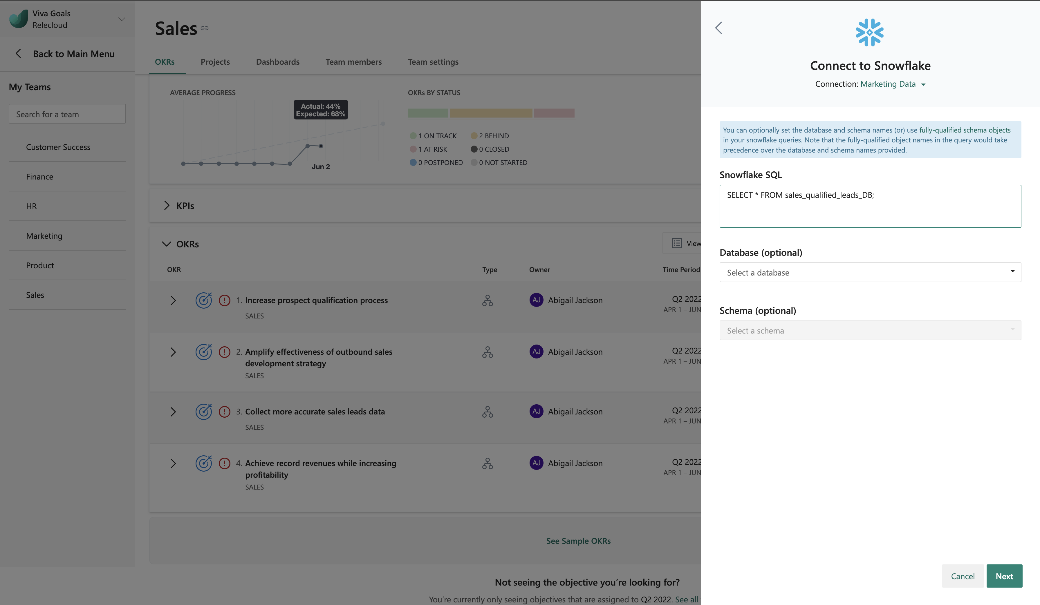 Al termine dell'installazione, gli utenti dell'organizzazione possono collegare il successo dei propri OKR direttamente i dati in un magazzino Snowflake.
