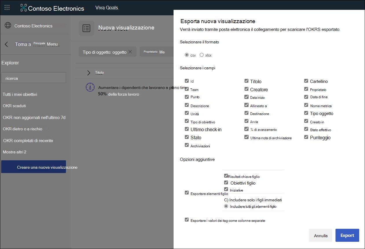 - Creare un nuovo OKR selezionando + Obiettivo nella finestra OKR principale. Verrà visualizzata la finestra Nuovo obiettivo in cui è possibile immettere un titolo per il nuovo obiettivo, aggiungere altri dettagli e selezionare Altre opzioni per aggiungere delega, autorizzazioni di visualizzazione e tag.
