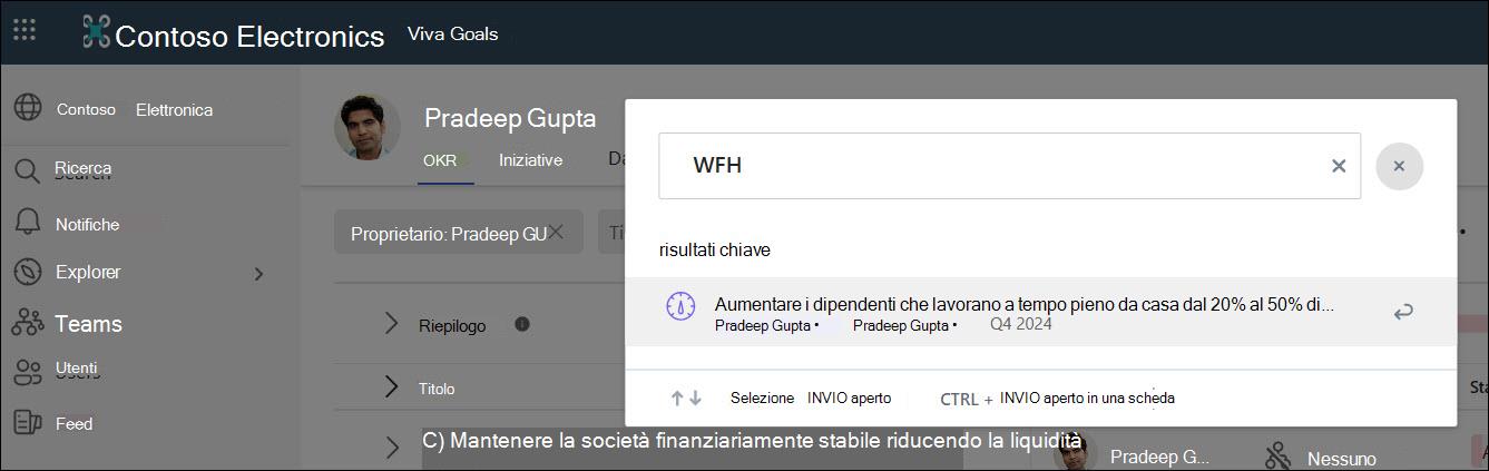 È possibile eseguire ricerche in base ai tag selezionando Cerca nel menu principale nel riquadro sinistro e quindi immettendo il nome del tag per il quale si vuole eseguire la ricerca in Cerca OKR, persone, team e altro ancora. Ad esempio, se si esegue la ricerca in base a WFH, i risultati restituiti includono l'OKR a cui è stato aggiunto il tag WFH nel passaggio precedente, come illustrato nell'immagine seguente.