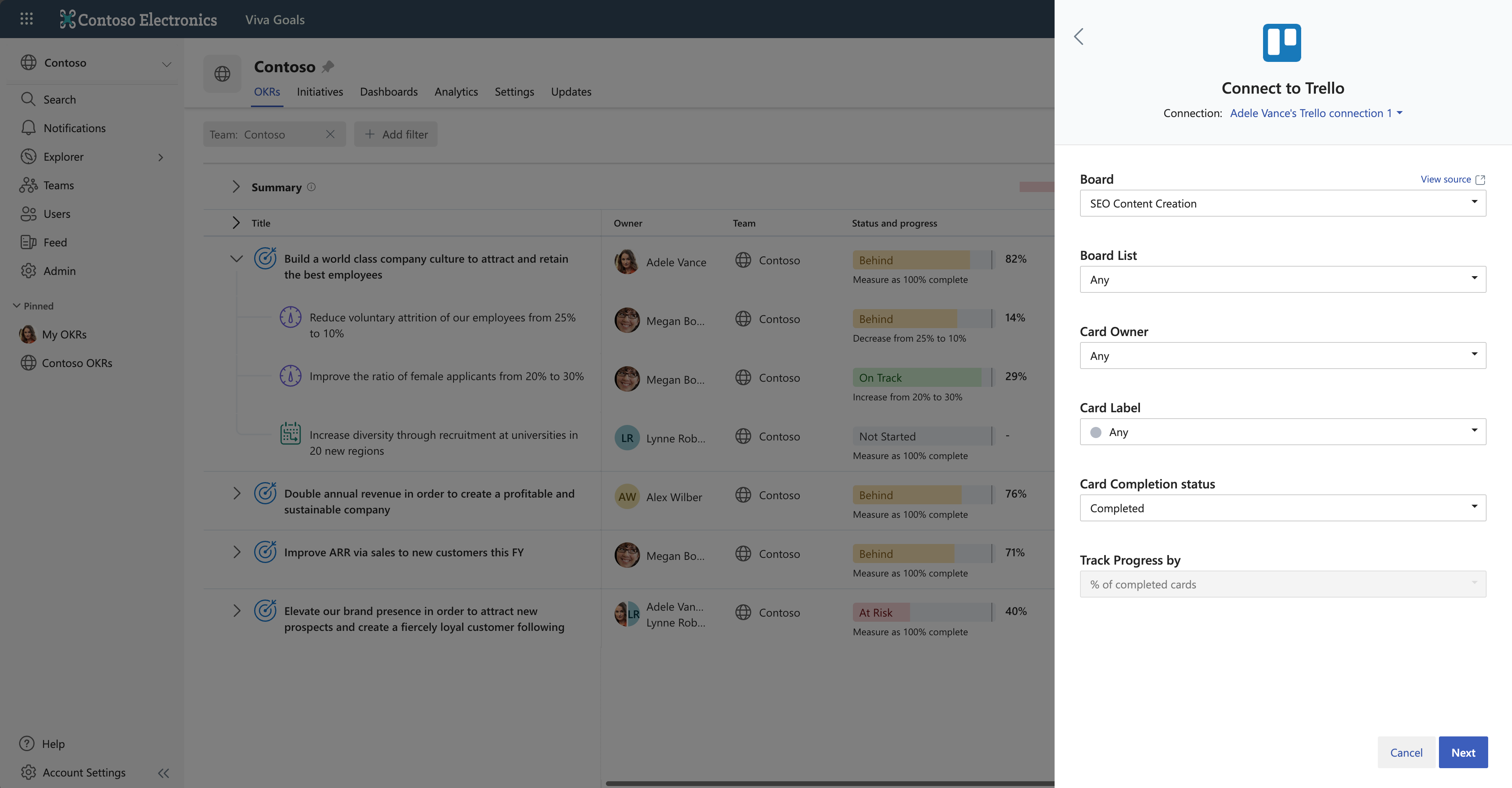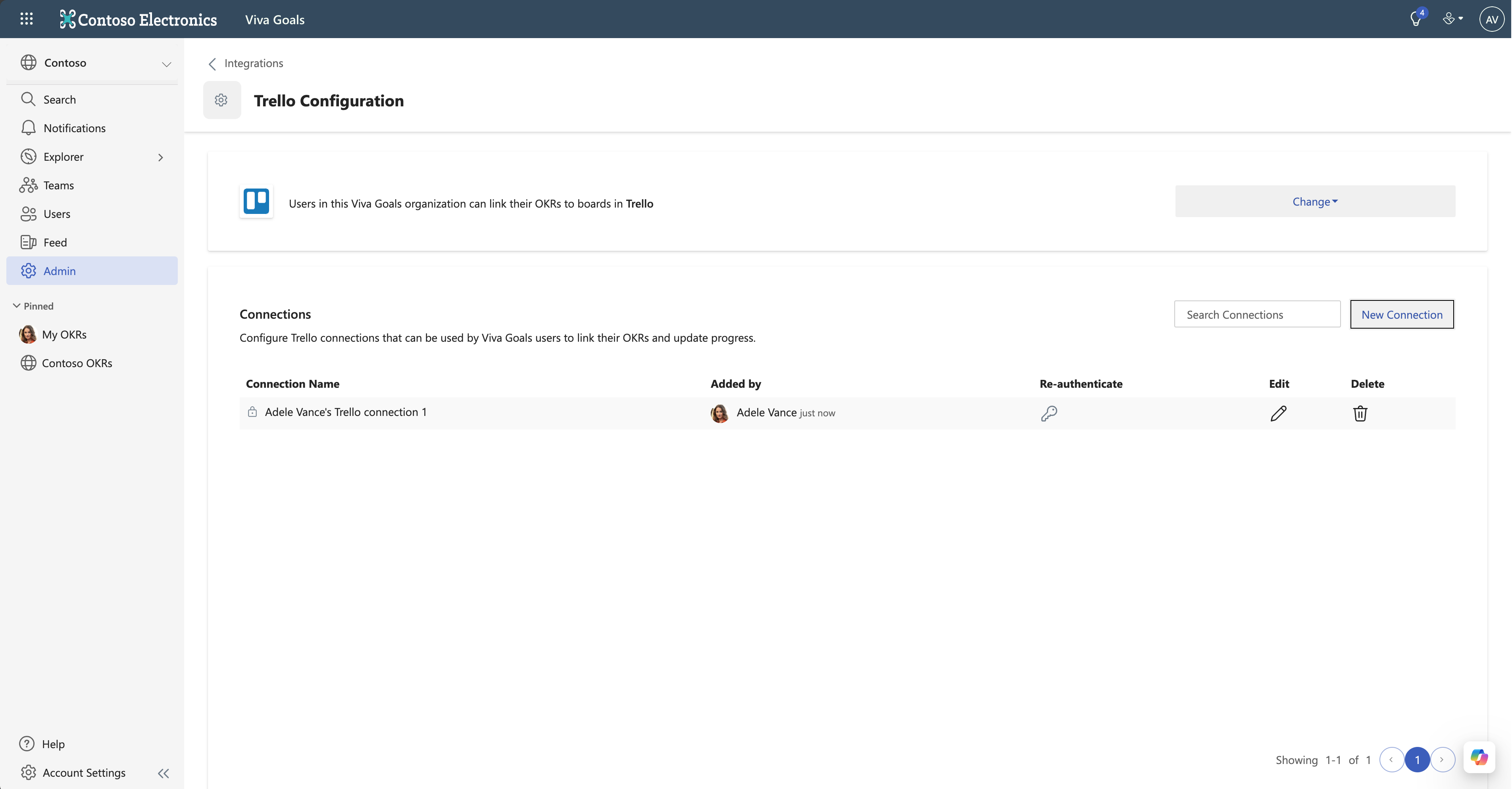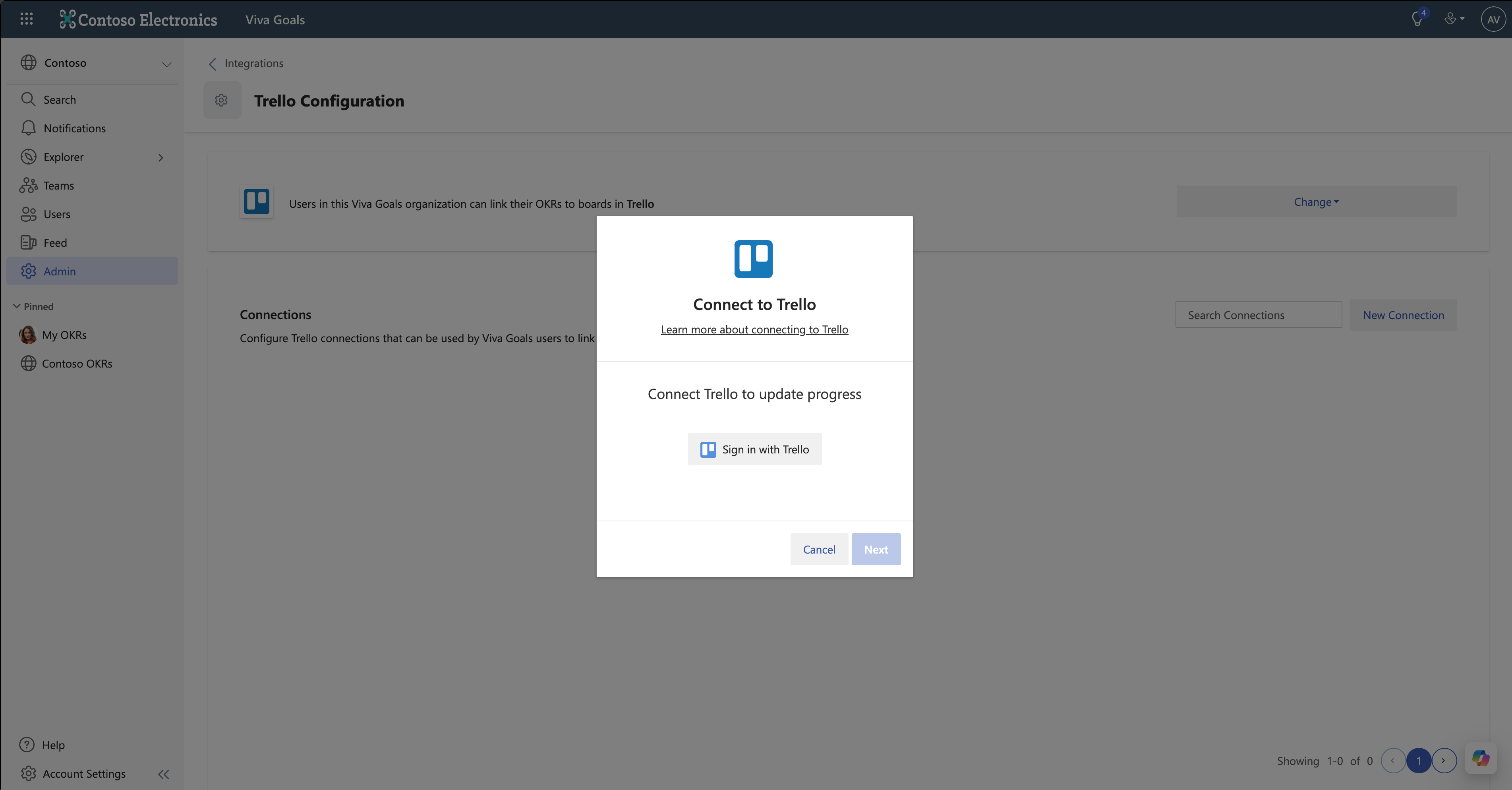 Se si è un amministratore, seguire questa procedura per configurare un'integrazione di Trello in Viva Goals: