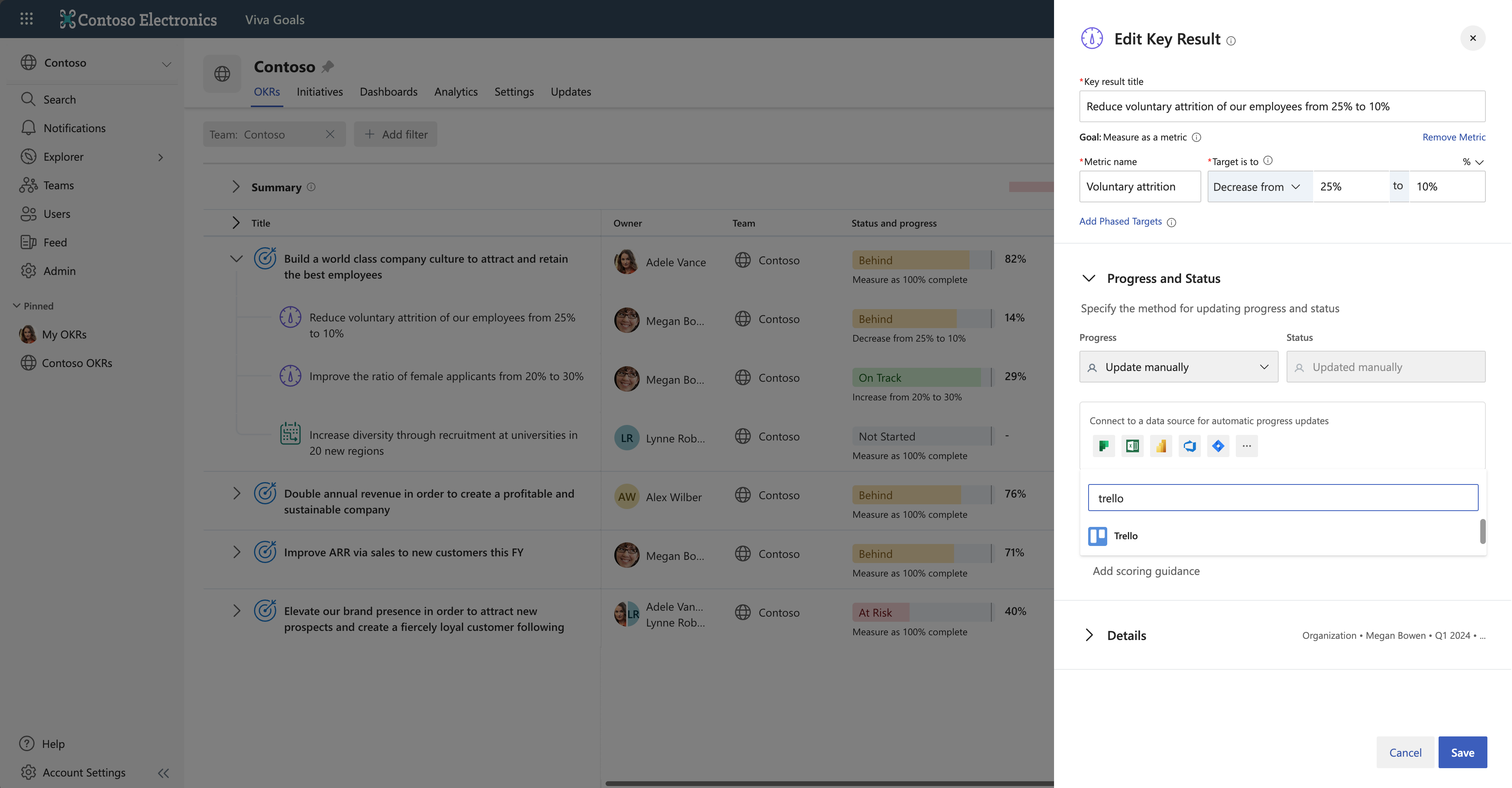 Quando si crea o si modifica un risultato chiave, nell'elenco a discesa Stato e stato verrà visualizzata una sezione con il testo "Connettersi a un'origine dati per gli aggiornamenti automatici dello stato". Cercare e selezionare l'icona Trello nell'elenco delle integrazioni.