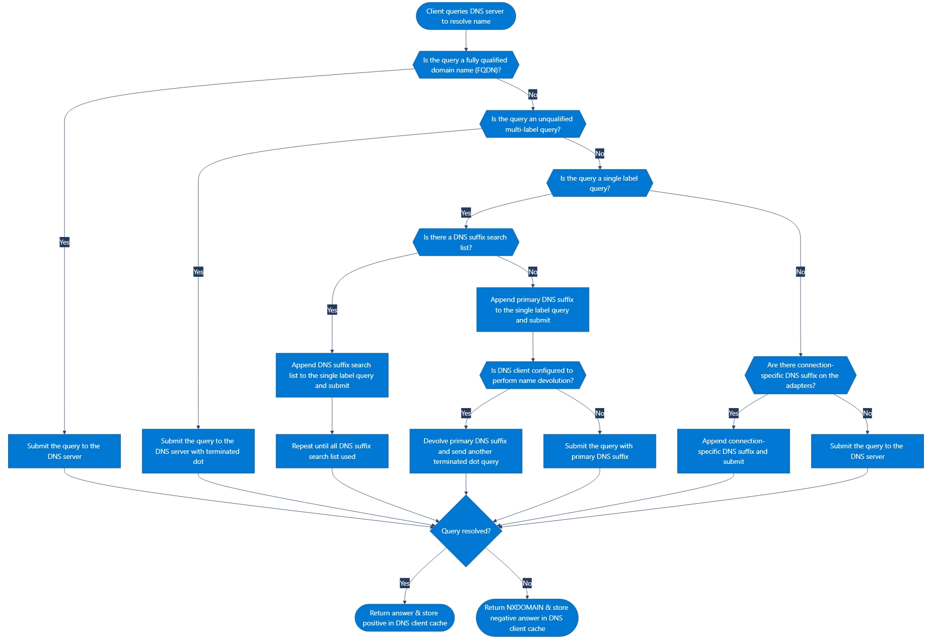 .), il client DNS lo invia al server DNS con un punto di terminazione (.). Ad esempio,www.contoso.com.Se la query non qualificata è un'etichetta singola come