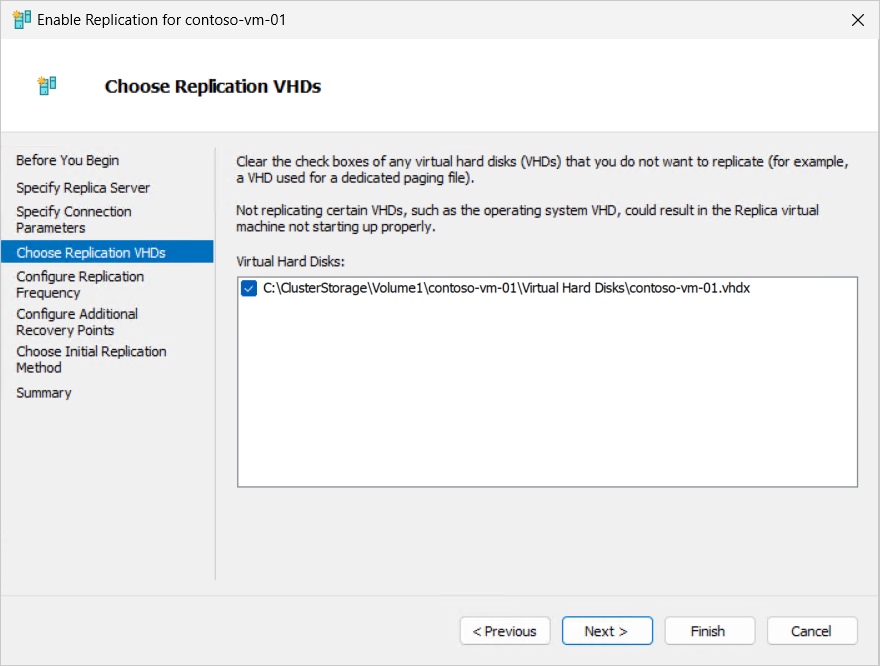 Per Scegliere dischi rigidi virtuali di replica, assicurarsi che le caselle di controllo per i dischi rigidi virtuali da replicare siano selezionate e deselezionare le caselle di controllo per tutti i dischi rigidi virtuali da escludere dalla replica. Quindi seleziona Avanti.