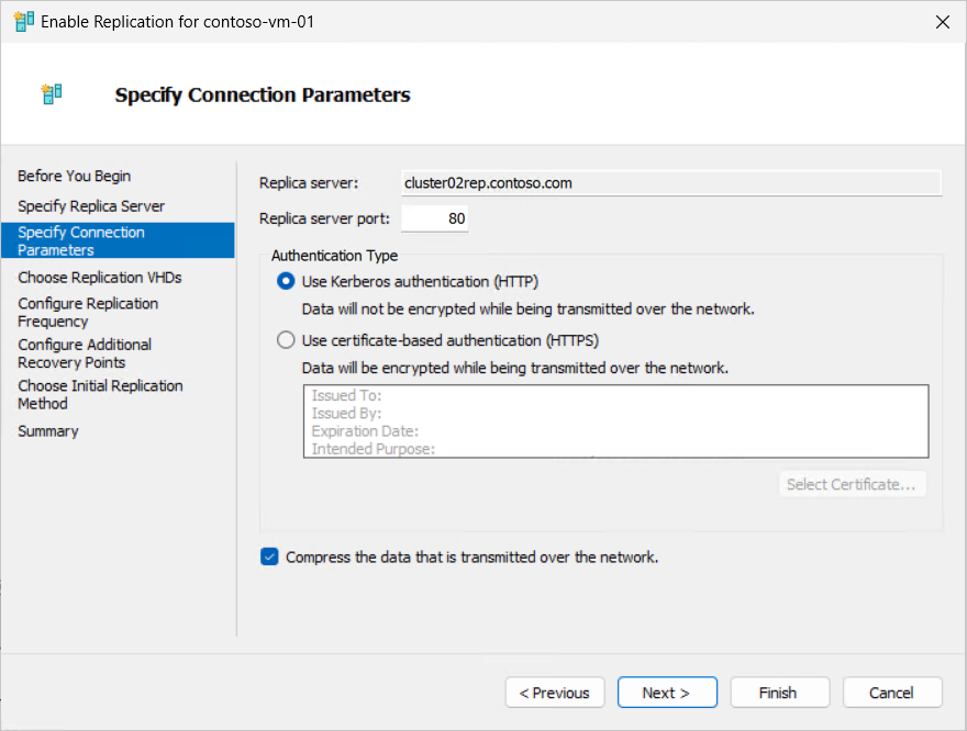 Esaminare le impostazioni del server di replica. Se si usa l'autenticazione basata su certificati, selezionare Seleziona certificato, viene richiesto di selezionare il certificato per l'host primario che soddisfa i requisiti. Se si desidera comprimere i dati trasmessi in rete, selezionare la casella. Seleziona Avanti.