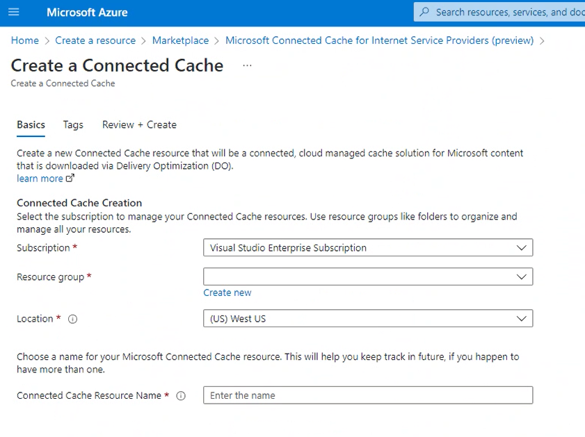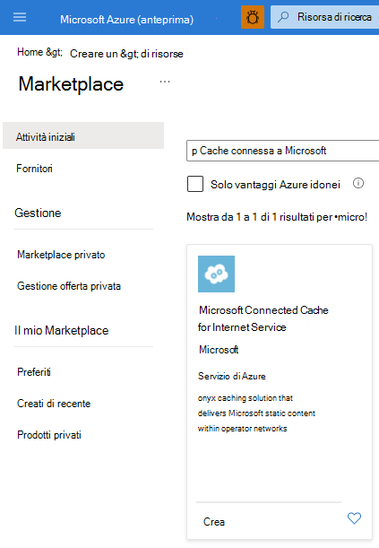 Passare alla portale di Azure. Selezionare Crea una risorsa. Cercare quindi Microsoft Connected Cache.