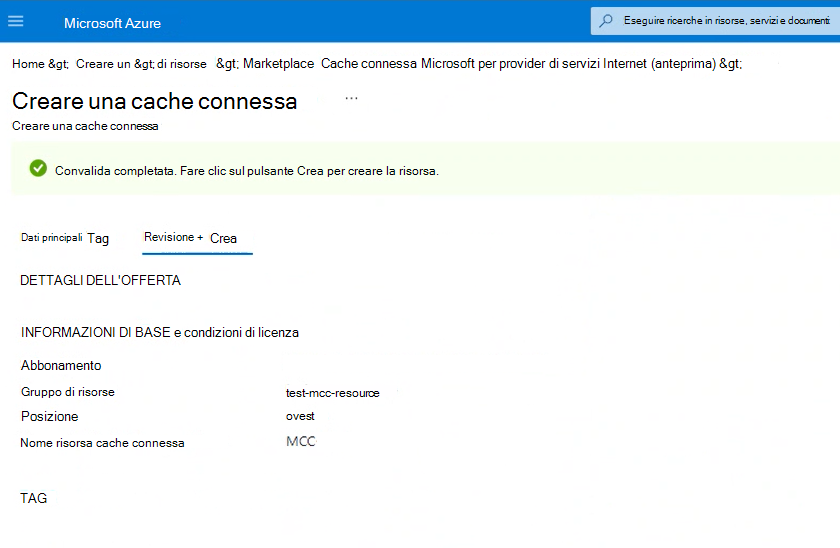 Dopo la verifica, seguire le istruzioni in Creare, effettuare il provisioning e distribuire il nodo della cache per creare il nodo della cache.