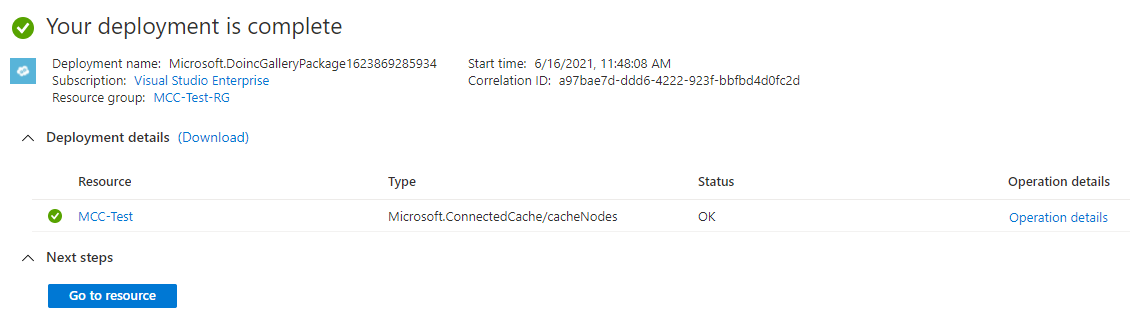 La creazione del nodo della cache potrebbe richiedere alcuni minuti. Dopo aver completato la creazione, verrà visualizzata una pagina Distribuzione completa come indicato di seguito. Selezionare Vai alla risorsa.