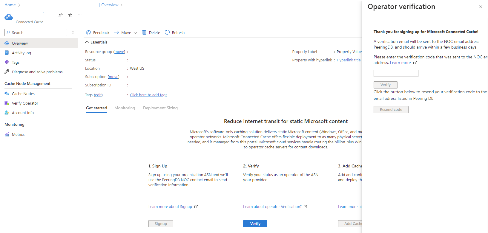 Dopo aver verificato le informazioni immesse, verrà inviato un codice di verifica all'indirizzo di posta elettronica NOC fornito nel database di peering. Dopo aver ricevuto il messaggio di posta elettronica, passare al portale di Azure >operatore MicrosoftConnected Cache>Settings> Verify e immettere il codice di verifica inviato all'indirizzo di posta elettronica NOC.