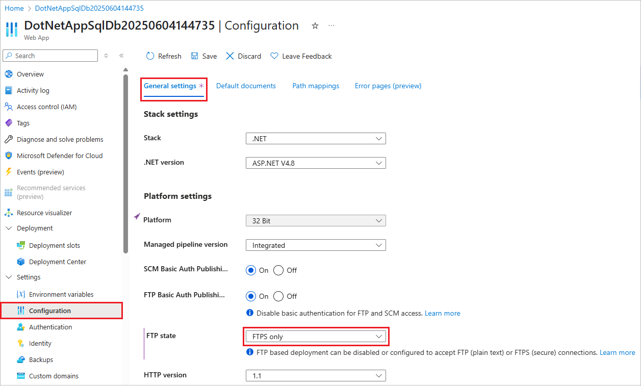 FTPS は、トランスポート層セキュリティ (TLS) と Secure Sockets Layer (SSL) を使用する、より安全な形式の FTP です。 セキュリティを強化するために、TLS/SSL 経由で FTPS を適用する必要があります。 FTP デプロイを使用しない場合は、FTP と FTPS の両方を無効にすることもできます。