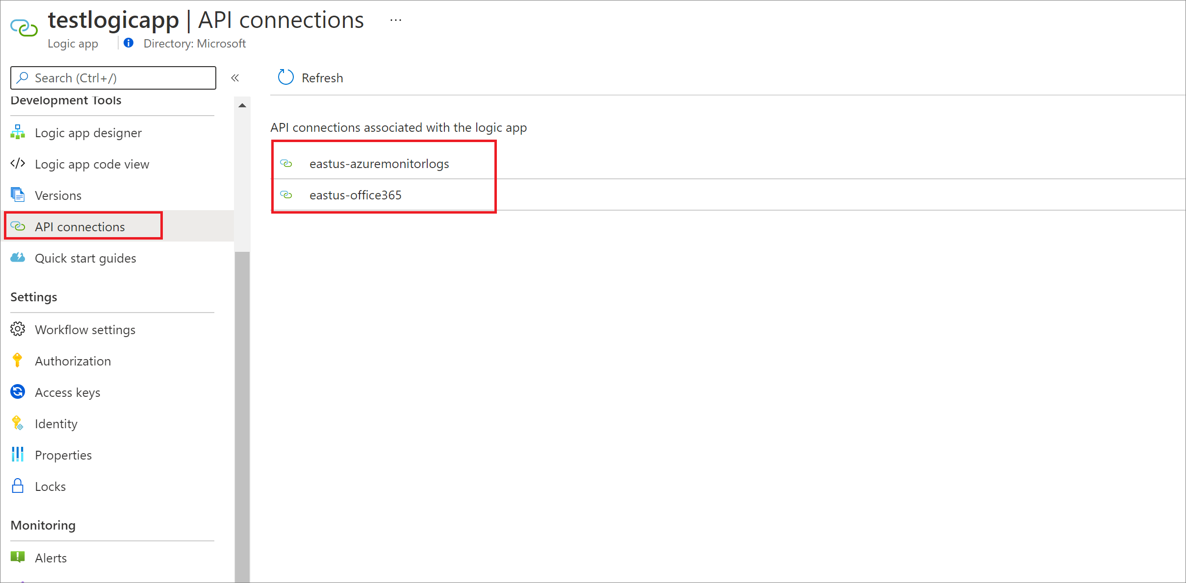 <location>-azuremonitorlogsおよび<location>-office365という形式の2つの接続が表示されます。つまり、eastus-azuremonitorlogsとeastus-office365です。これらの各接続に移動し、メニュー項目の[API接続の編集]を選択します。 表示される画面で 、[承認] を選択し、承認が完了したら接続を保存します。