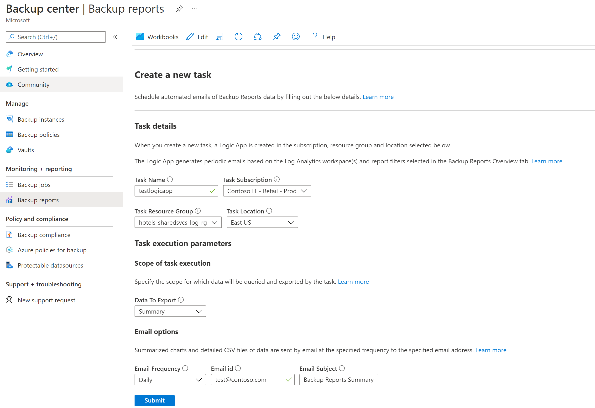 バックアップ レポートで使用できるメール レポート機能を使用すると、自動化されたタスクを作成して、メールで定期的なレポートを受信できます。 この機能を利用するには、指定した入力に基づいて、選択した Log Analytics (LA) ワークスペースからデータのクエリを実行するロジック アプリを Azure 環境にデプロイします。 ロジック アプリとその価格については、こちらをご覧ください。