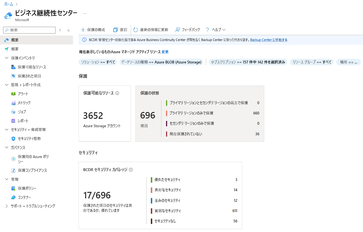 回復性により、保護されたストレージ アカウントの 保護状態 と、 バックアップが現在構成されていないストレージ アカウントを簡単に監視できます。