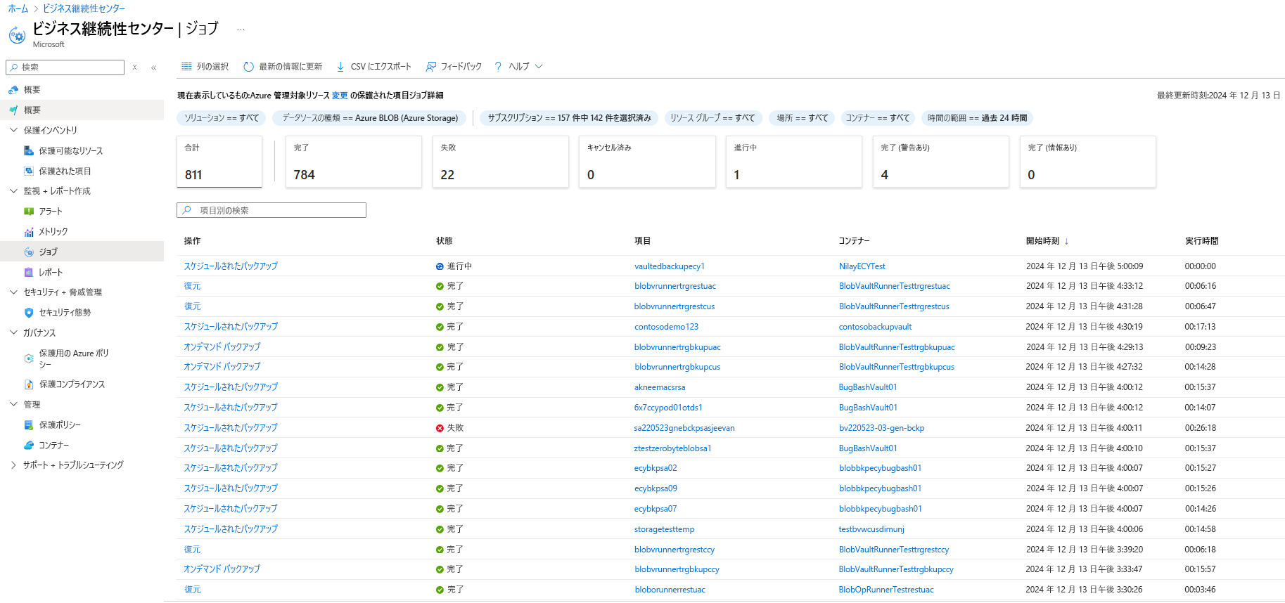 復元の追跡: 復元の詳細と状態を追跡するには、 [バックアップ ジョブ] ビューを使用します。 これを行うには、「 回復性>ジョブ」に移動します。 復元が実行されている間は、状態が [実行中] と表示されます。