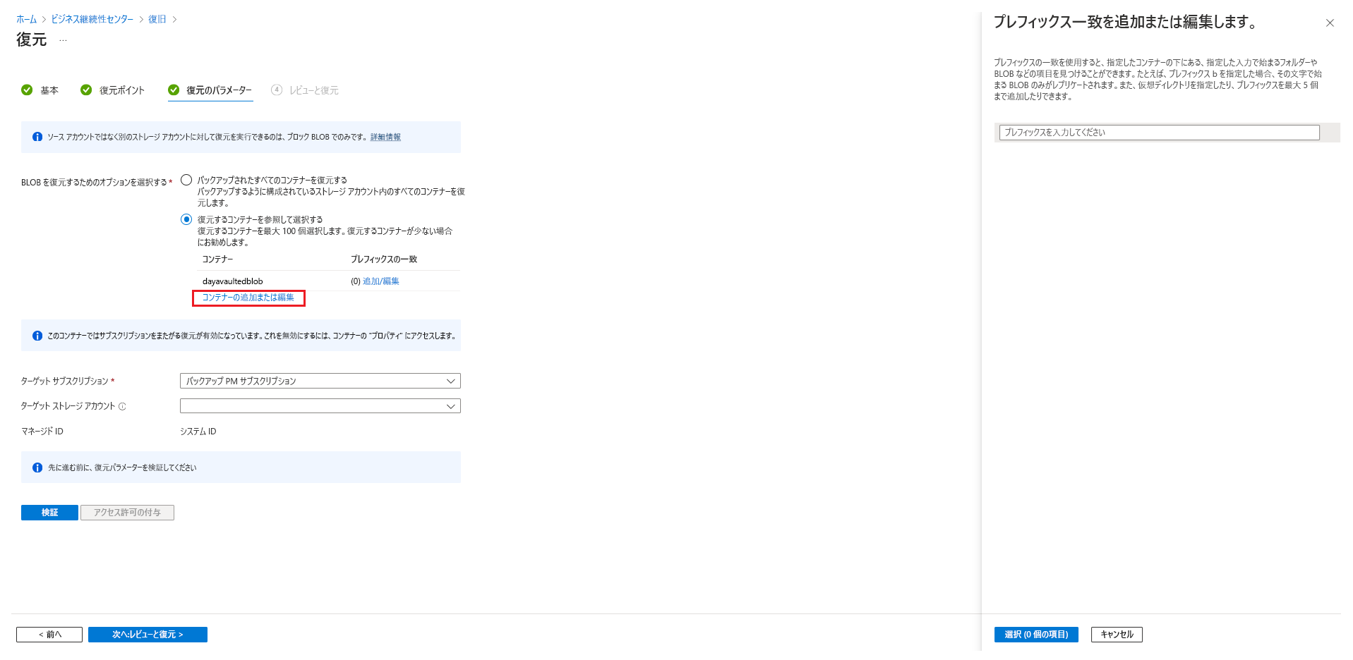 [Select blobs to restore using prefix match](プレフィックスの一致を使用して復元する BLOB を選択する) : このオプションを使用すると、プレフィックスの一致を使用して BLOB のサブセットを復元できます。 単一のコンテナー内または複数のコンテナー全体の BLOB の最大 10 個の辞書式範囲を復元して、以前の特定の時点の状態にそれらの BLOB を戻すことができます。 次の点に注意してください。