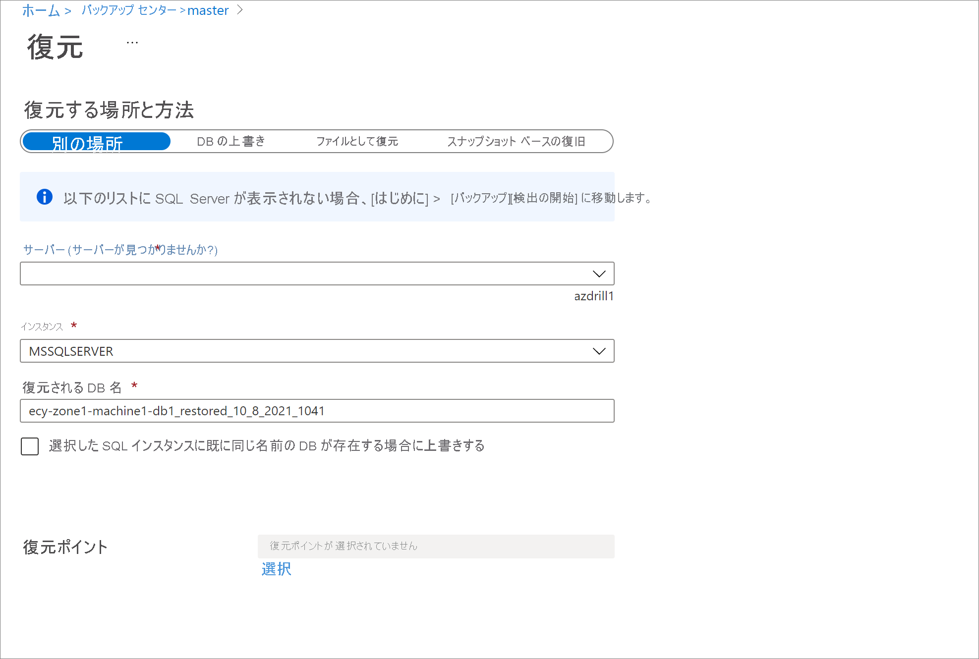 - サーバー上で複数のインスタンスを実行している場合は、すべてのインスタンスが稼働している必要があります。 そうでない場合、データベースを復元する対象サーバーの一覧にサーバーが表示されません。 詳細については、トラブルシューティングの手順を参照してください。