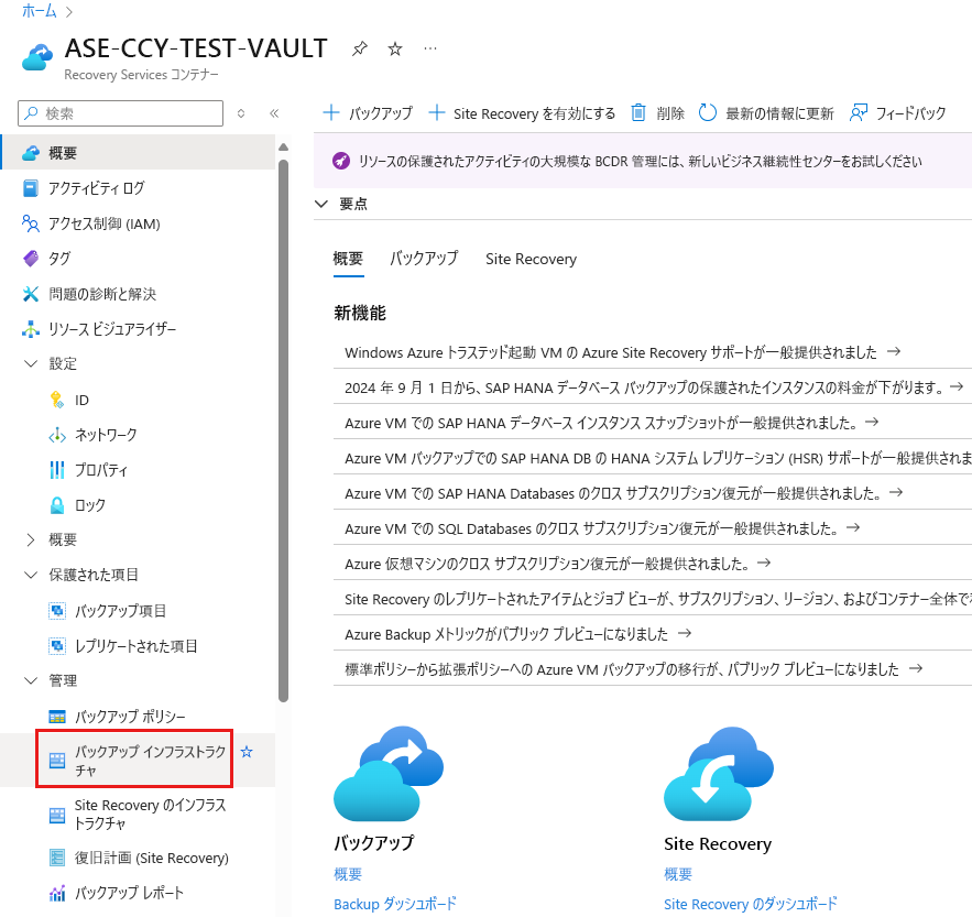 [Recovery Services コンテナー] の [管理] で、[バックアップ インフラストラクチャ] を選びます。