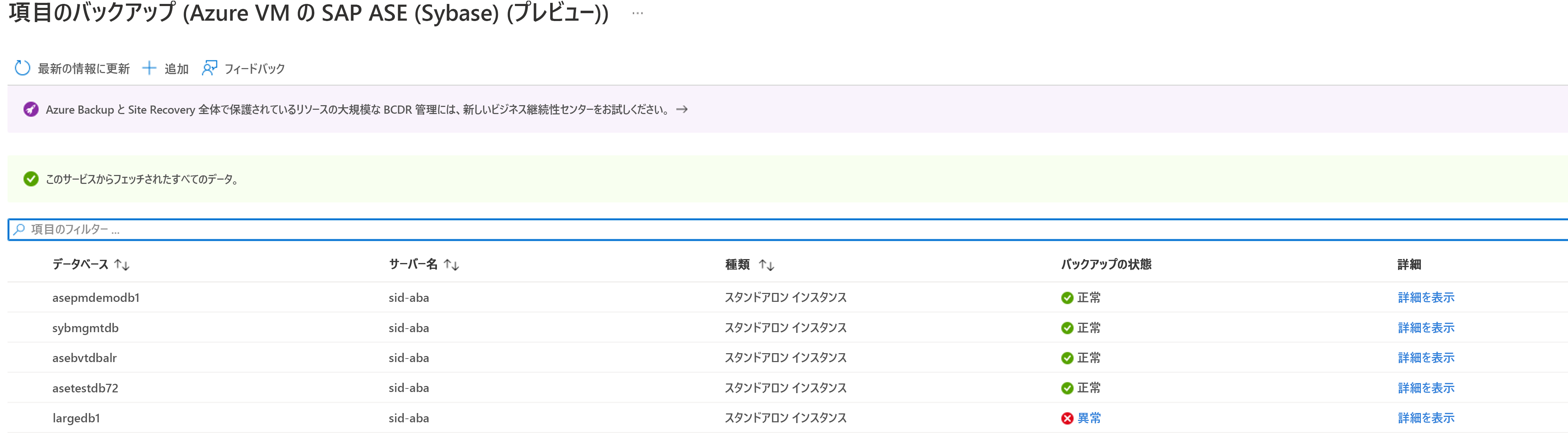 バックアップが SAP ASE データベースに構成されていない場合は、「Azure VM 上の SAP ASE データベースをバックアップする」を参照してください。 サポートされている構成とシナリオの詳細については、「Azure VM 上の SAP ASE データベースのバックアップに関するサポート マトリックス」を参照してください。