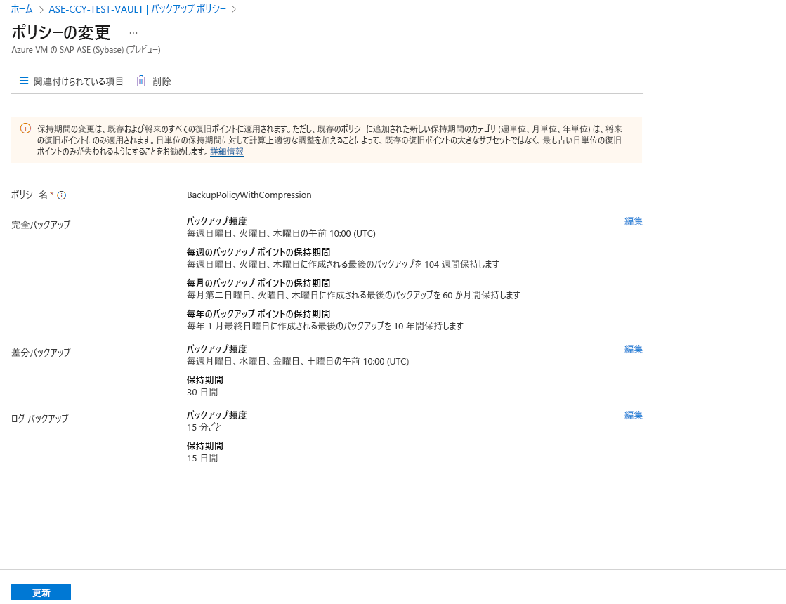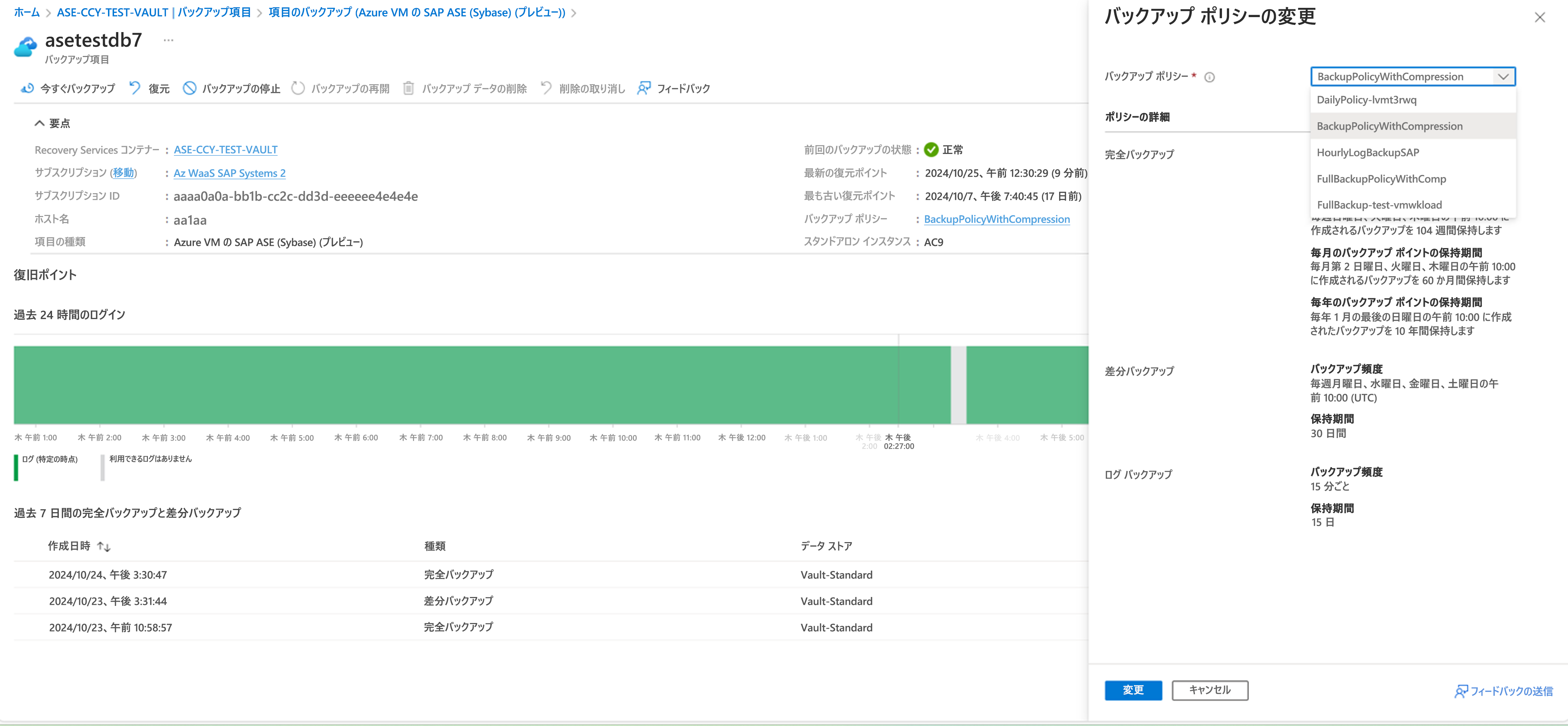 SAP ASE バックアップ項目の >[詳細を表示する]>[バックアップ ポリシー]>[バックアップ ポリシーを変更する] 基になるポリシーを変更できます。