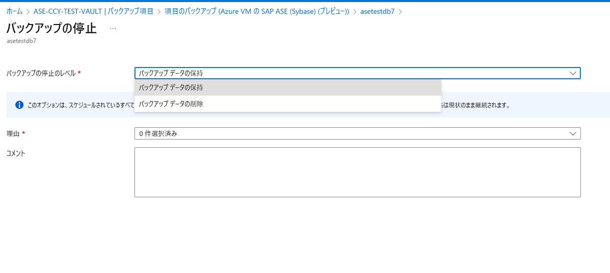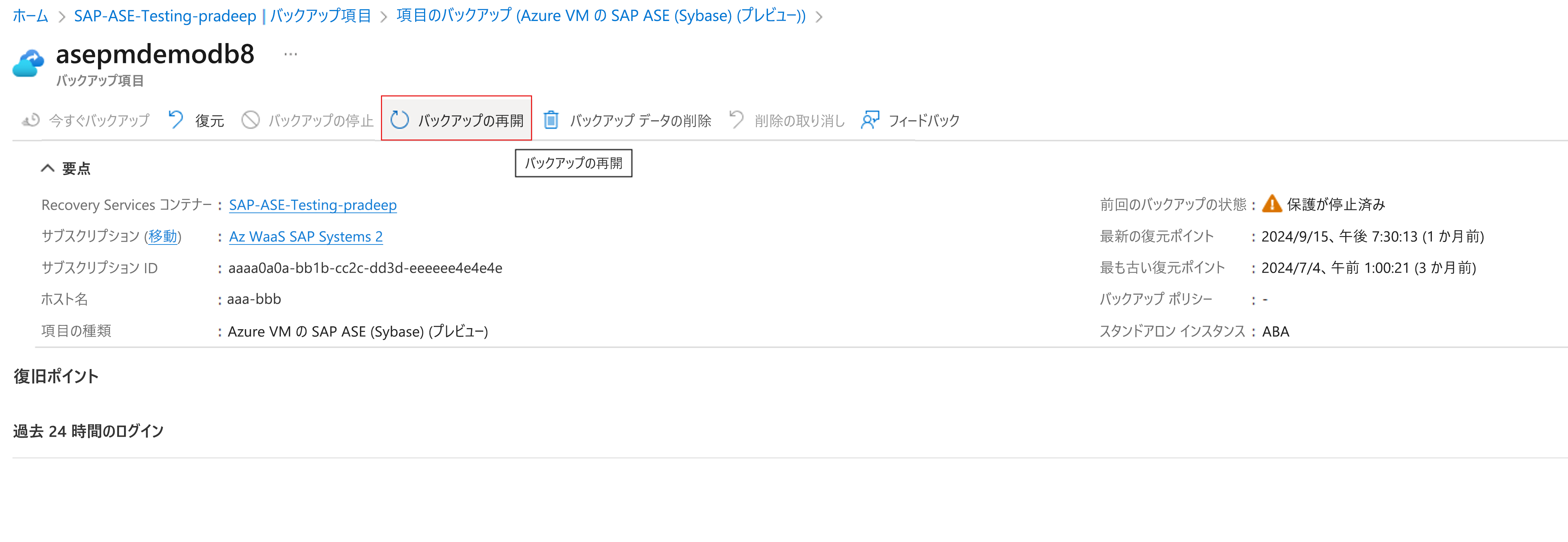 SAP ASE データベースの保護を停止するとき、[バックアップ データの保持] オプションを選択した場合、後で保護を再開できます。 バックアップされたデータを保持しない場合は、保護を再開できません。