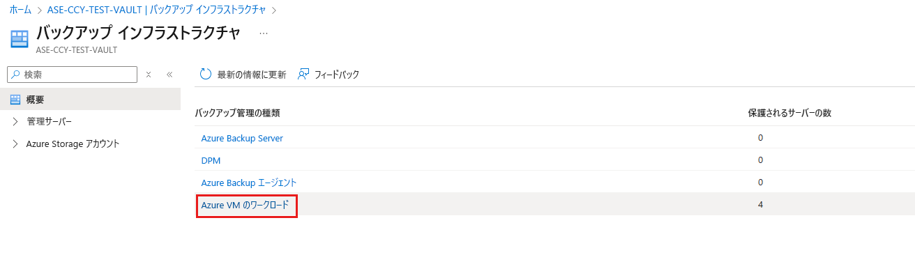 [ バックアップ インフラストラクチャ ] ウィンドウの [ バックアップ管理の種類] で、[ Azure VM のワークロード] を選択します。