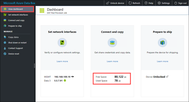 ![空き領域と使用領域を表示した [ダッシュボード] ページのスクリーンショット。](media/data-box-deploy-copy-data-via-copy-service/verify-used-space-dashboard.png)