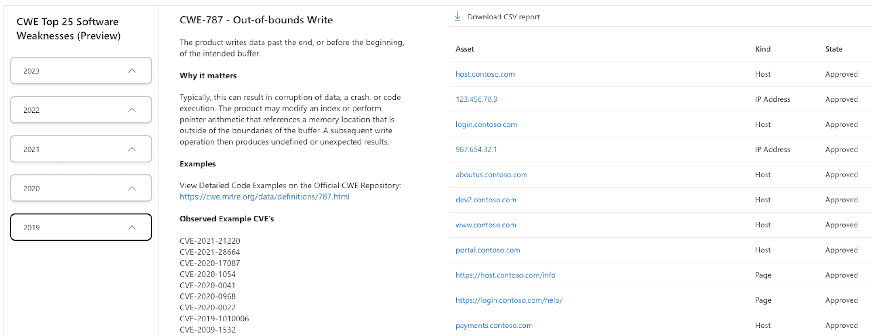 このダッシュボードは、毎年 MITRE によって提供される上位 25 共通脆弱性タイプ一覧 (CWE) の一覧に基づいています。 これらの CWE は、見つけて悪用することが容易な、最も一般的でかつ影響力の大きいソフトウェア脆弱性を表しています。 このダッシュボードには、過去 5 年間にこの一覧に含まれていたすべての CWE が表示され、各 CWE の影響を受けている可能性があるすべてのインベントリ資産が一覧表示されます。 各 CWE について、このダッシュボードには脆弱性の説明と例が表示され、関連する CVE が一覧表示されます。 CWE は年ごとに整理され、各セクションは展開可能または折りたたみ可能です。 このダッシュボードを参照すると、他の観察された悪用に基づいて組織に対する最大のリスクを識別しやすくなるため、脆弱性の修復作業に役立ちます。