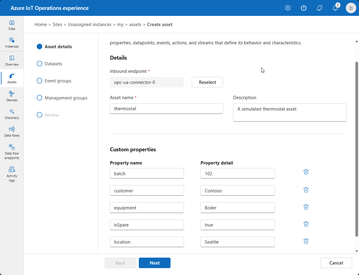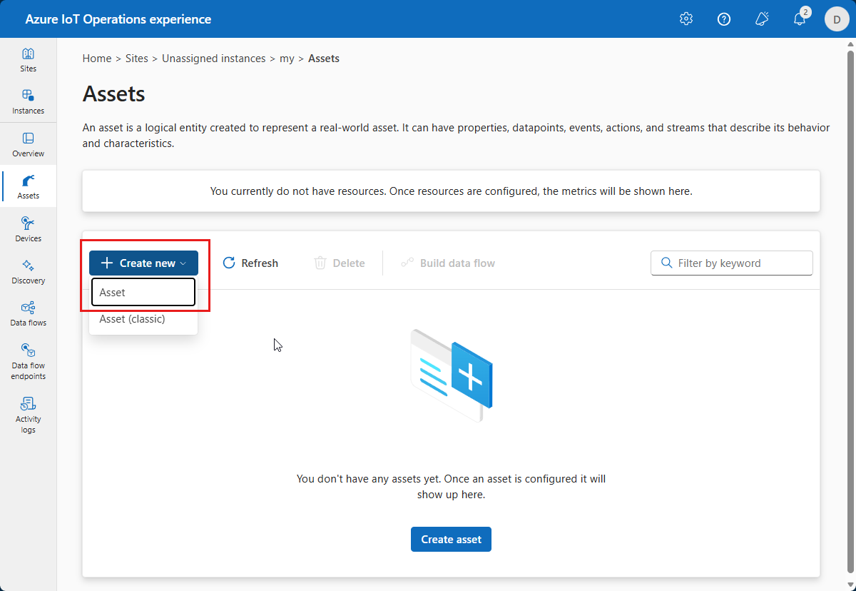 このチュートリアルでは、操作エクスペリエンス Web UI を使用して資産を作成します。 Azure CLI を使用し、これらのタスクの一部を完了することもできます。