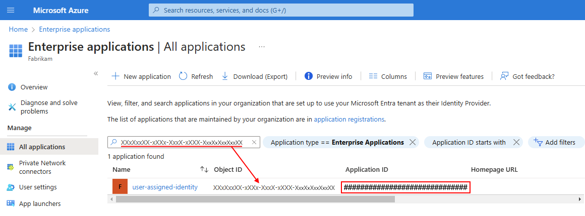 [すべてのアプリケーション] ページの検索ボックスに、マネージド ID のオブジェクト ID を入力します。 結果から、一致するエンタープライズ アプリケーションを見つけて、その [アプリケーション ID] をコピーします。