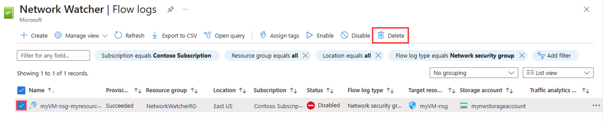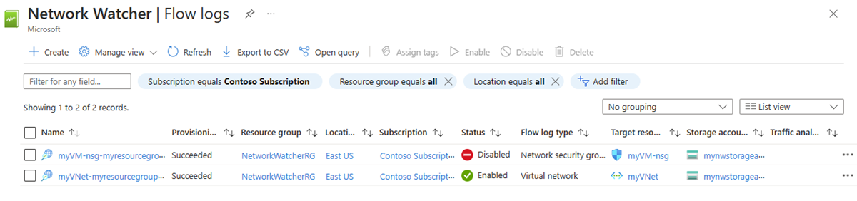 移行したネットワーク セキュリティ グループ フロー ログの状態が無効になったことを Azure portal で確認します。 移行プロセスの結果として、新しく作成された仮想ネットワーク フロー ログも確認します。