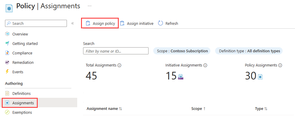 [割り当て] を選択し、[ポリシーの割り当て] を選択します。