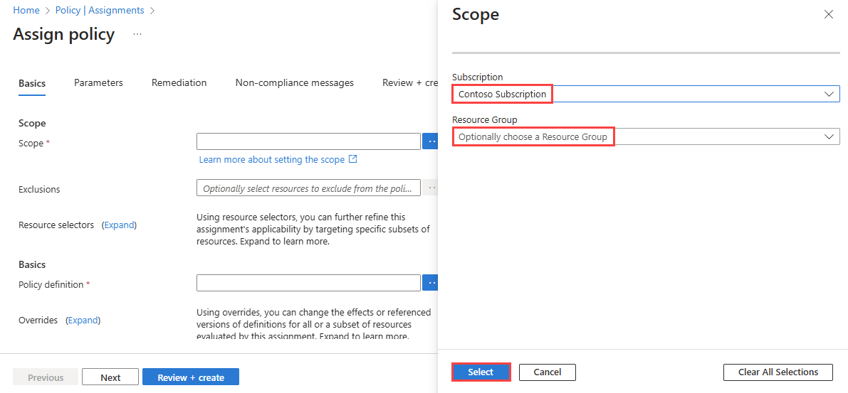 [スコープ] の横にある省略記号 (...) を選択して、ポリシーを使用して確認する仮想ネットワークを含む Azure サブスクリプションを選択します。 仮想ネットワークを含むリソース グループを選択することもできます。 選択した後、[選択] ボタンを選択します。