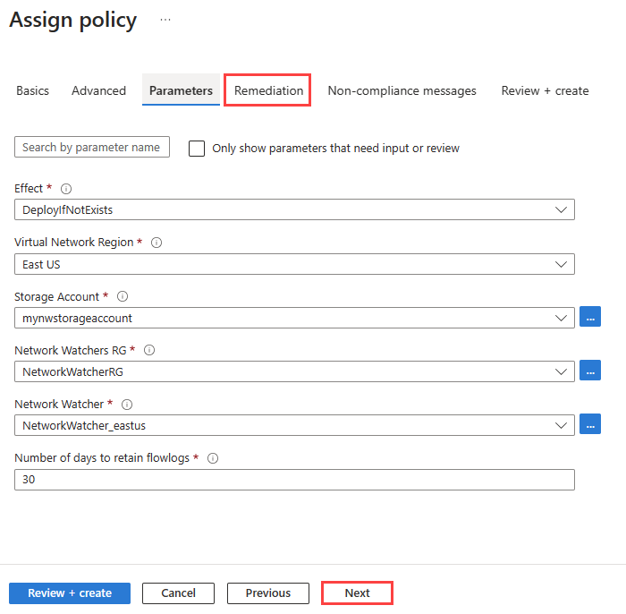 設定 値 効果 DeployIfNotExists を選択すると、ポリシーの実行が有効になります。 その他の使用可能なオプションは、[無効] です。 仮想ネットワーク リージョン ポリシーで対象とする仮想ネットワークのリージョンを選択します。 ストレージ アカウント ストレージ アカウントを選択します。 ストレージ アカウントは、仮想ネットワークと同じリージョンに存在する必要があります。 ネットワークウォッチャーRG Network Watcher インスタンスのリソース グループを選択します。 ポリシーにより作成されたフロー ログは、このリソース グループに保存されます。 ネットワーク ウォッチャー 選択したリージョンの Network Watcher インスタンスを選択します。 フローログを保持する日数 フロー ログ データをストレージ アカウントに保持する日数を選択します。 既定の値は 30 日です。 アイテム保持ポリシーを適用しない場合は、「0」と入力します。 [次へ] または [修復] タブを選択します。