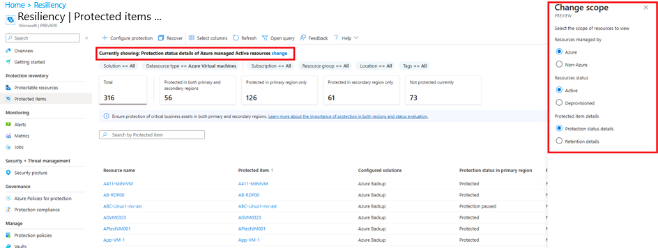 Azure の回復性を使用すると、スコープ ピッカーを使用して既定のビューを変更できます。 現在表示されている: Azure マネージド アクティブ リソースの保護の詳細 に対応する 変更 を選択します。