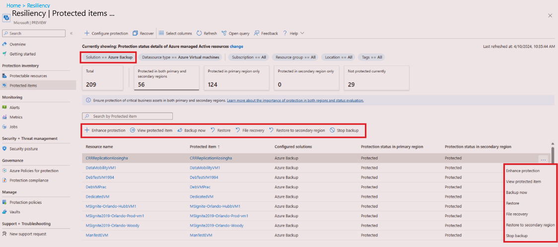 回復性管理者として、バックアップまたはレプリケーションが構成されていない重要なリソースの保護を特定して構成します。 保護の詳細を表示することもできます。
