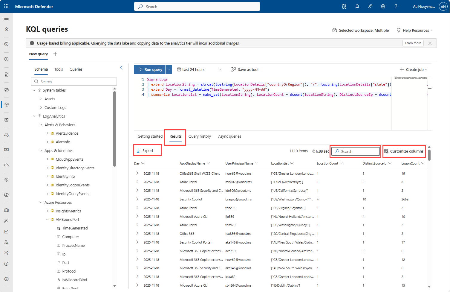 結果ウィンドウにクエリの結果が表示されます。 結果はテーブル形式で表示でき、結果ウィンドウの左上隅にある [エクスポート] ボタンを使用して CSV ファイルに結果を エクスポート できます。 [空の列を表示] ボタンを使用して 、空の列 の表示を切り替えます。 [ 列のカスタマイズ ] ボタンを使用すると、結果ウィンドウに表示する列を選択できます。