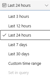 クエリ エディターの上にあるタイム ピッカーを使用して、クエリの時間範囲を選択します。 カスタム時間範囲オプションを使用すると、特定の開始時刻と終了時刻を設定できます。 期間は最大 12 年間です。
