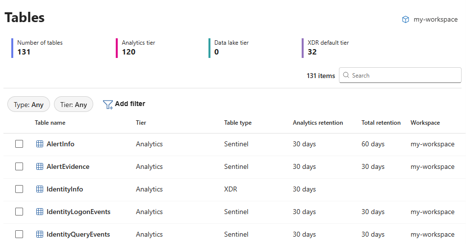 基本的なログ テーブルは、Defender ポータルから Microsoft Sentinel ワークスペースで表示できますが、現在管理できるのは Log Analytics ワークスペースのみです。 Defender ポータルからこれらのテーブルを管理するには、Microsoft Sentinel ワークスペースでテーブル プランを基本から分析に変更します。