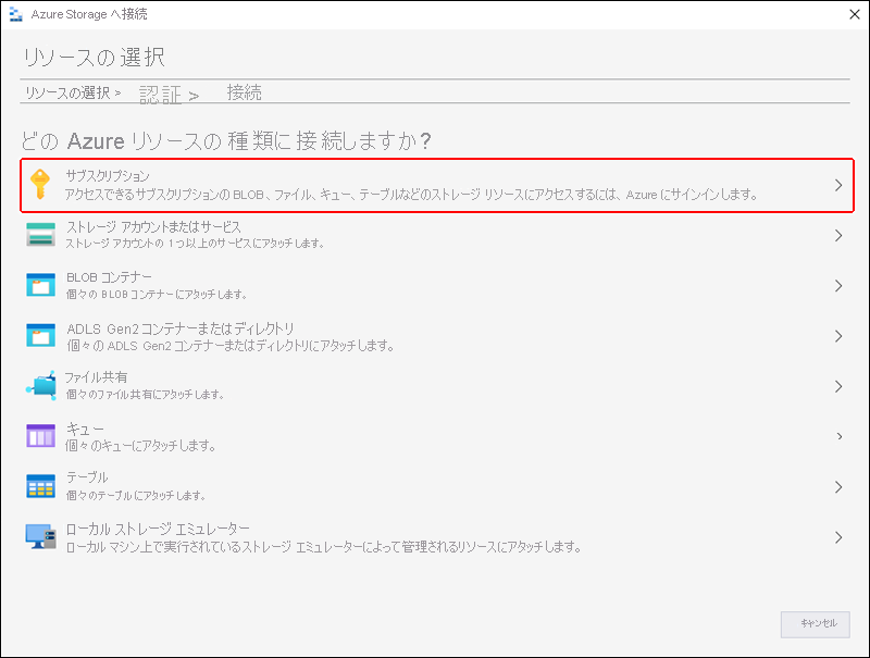 ![Microsoft Azure Storage Explorer の [リソースを選択します] ペインを示すスクリーンショット](media/data-lake-storage-explorer-acl/storage-explorer-connect-sml.png)