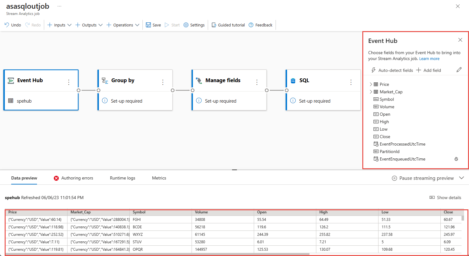 このセクションでは、ノーコード エディターを使用して Azure Stream Analytics ジョブを作成します。 ジョブにより、Event Hubs インスタンス (イベント ハブ) からのデータ ストリーミングが変換され、結果データが Azure SQL データベースに格納されます。