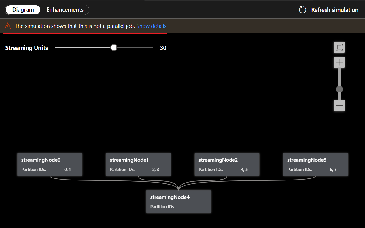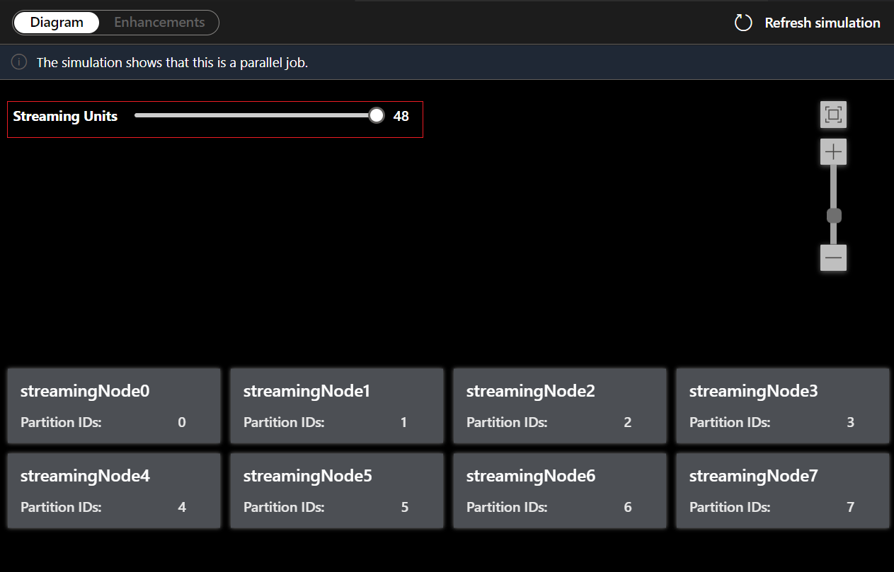 ストリーミング ユニットを調整して、ストリーミング ノードがさまざまな SU でどのように割り当てられるかをシミュレートすることもできます。 ワークロードを処理するために必要な SU の数を把握できます。