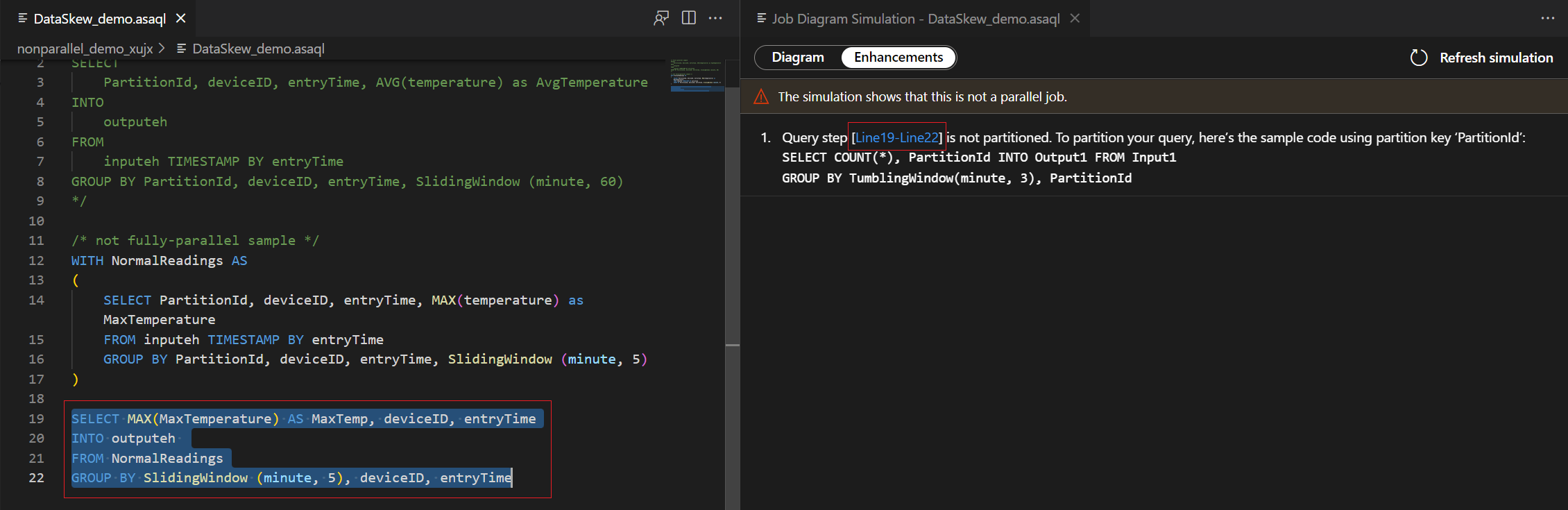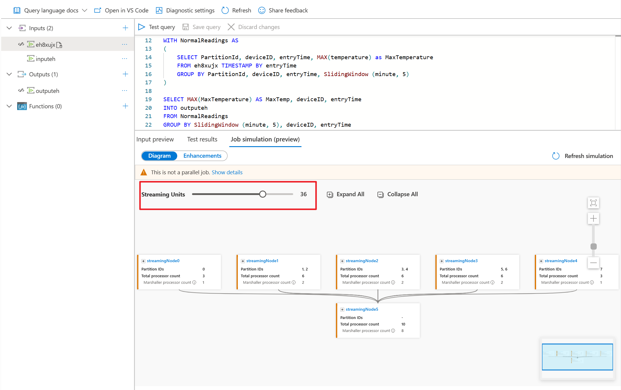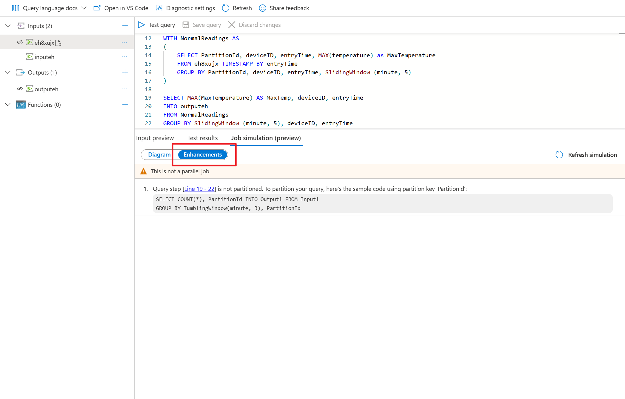 ジョブ シミュレーション機能では、Azure でのジョブによるトポロジの実行方法をシミュレートします。 このチュートリアルでは、編集候補に基づいてクエリのパフォーマンスを向上させ、並列で実行する方法について説明します。 例として、イベント ハブから入力データを受け取り、結果を別のイベント ハブに送信する非並列ジョブを使用しています。